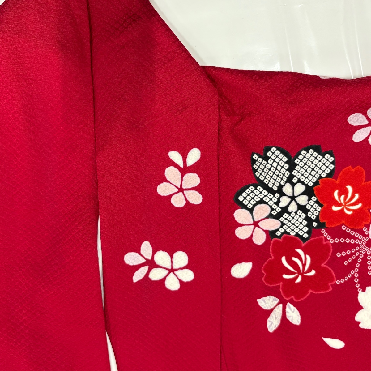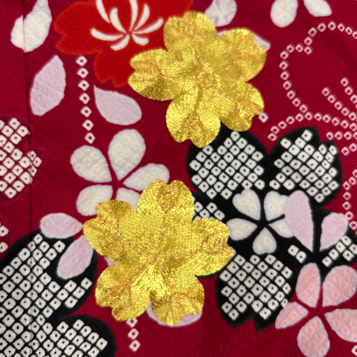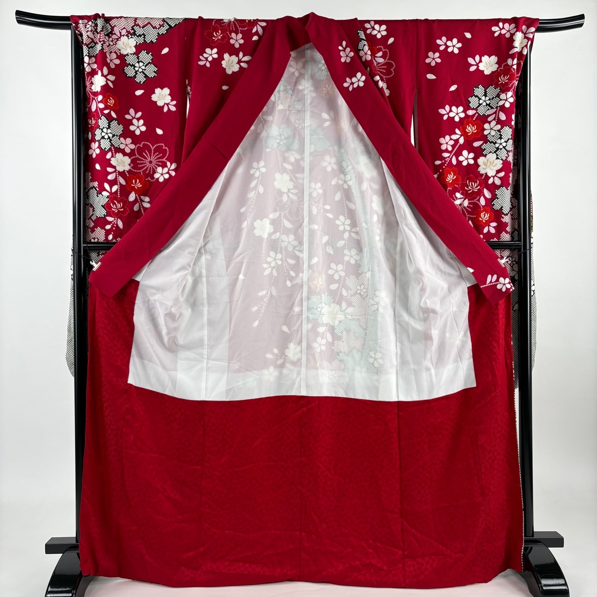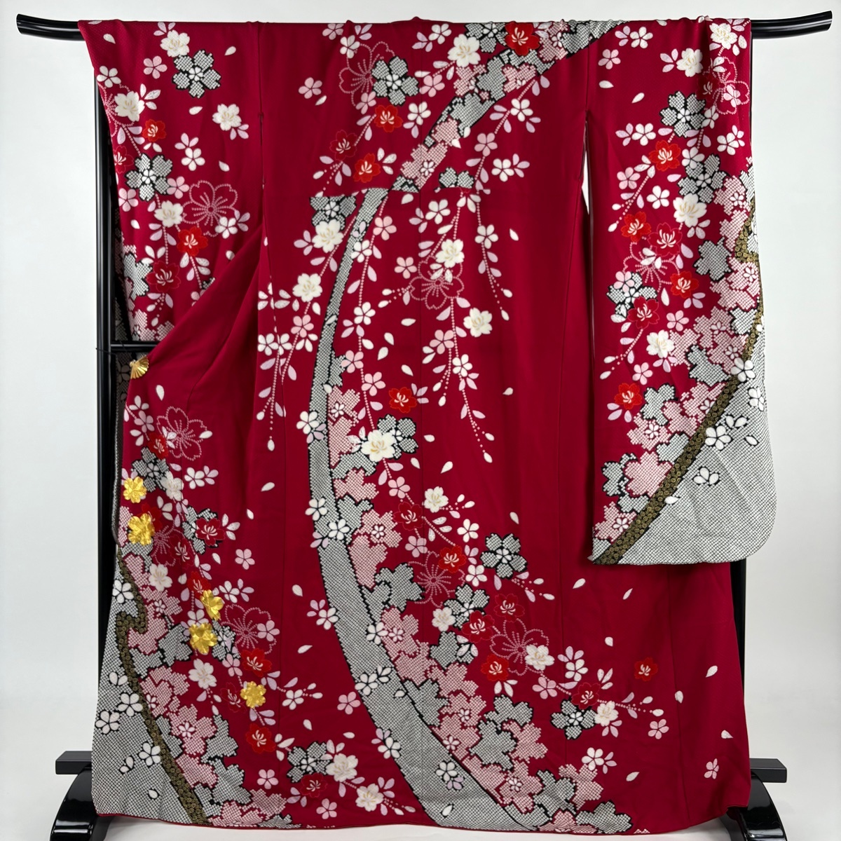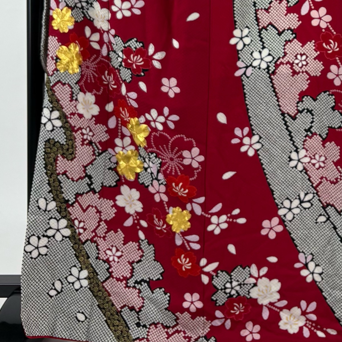 | 振袖 美品 名品 桜 花びら 金糸 金彩 赤 袷 身丈170 裄丈73 L 正絹 【中古】 |