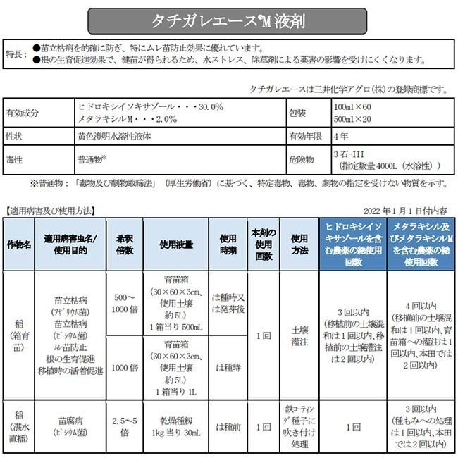 ・有効成分:ヒドロキシイソキサゾール・メタラキシルM