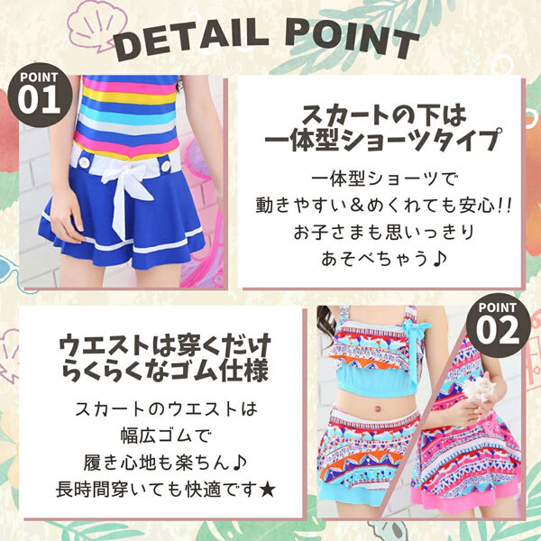 内 容 | ■女の子 水着 ワンピーススタイル カラフル ■サイズ:L/120相当(身長110-130cm 胸囲54-64cm ウエスト52-62cm) ■カラー:ピンク ・ワンピース×2点 ・ビキニ×1点 女の子らしさ満点のワンピーススタイル! バックスタイルまでかわいい★ ひらひらのデザインが可愛い♪ リボンやフレアを使った女の子らしさが詰まった キュートなデザイン。 ママも安心!肌の露出が控えめ。 お肌の露出を抑え、夏の強い日差しからカード! 水着の跡がくっきり残らないのもポイント★ 裏地付きで透けない! 大切なお子様が着るものだからこそしっかり裏地付き! トップス・ショーツ全面に裏地付きで安心&快適★ |