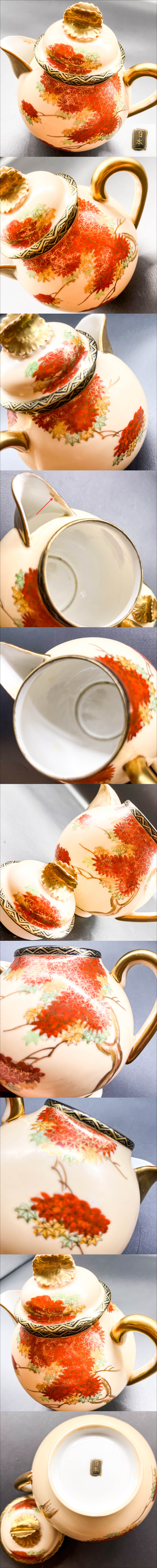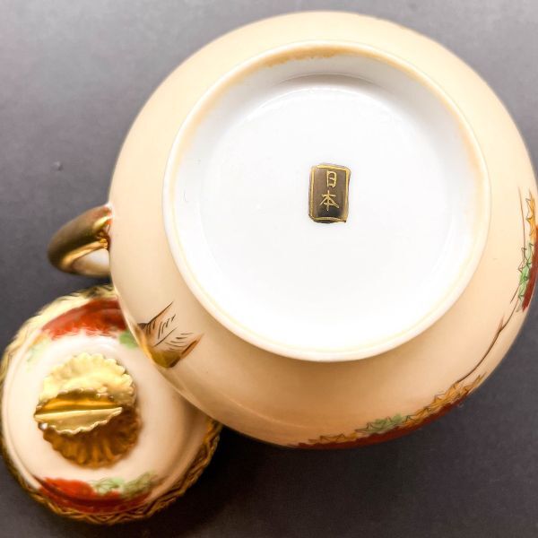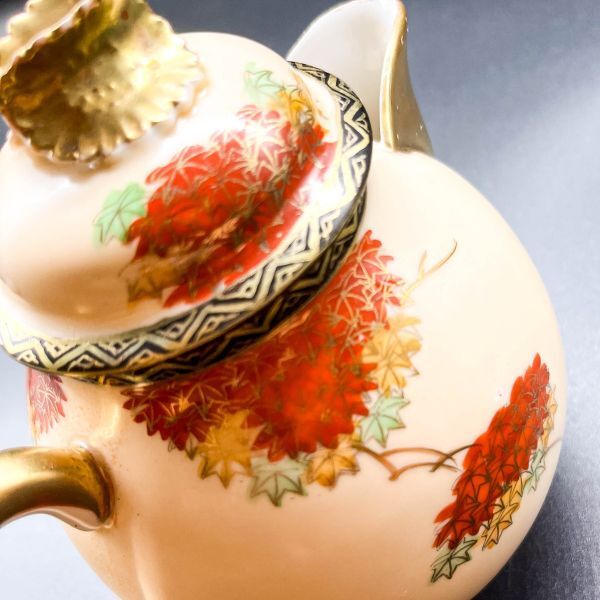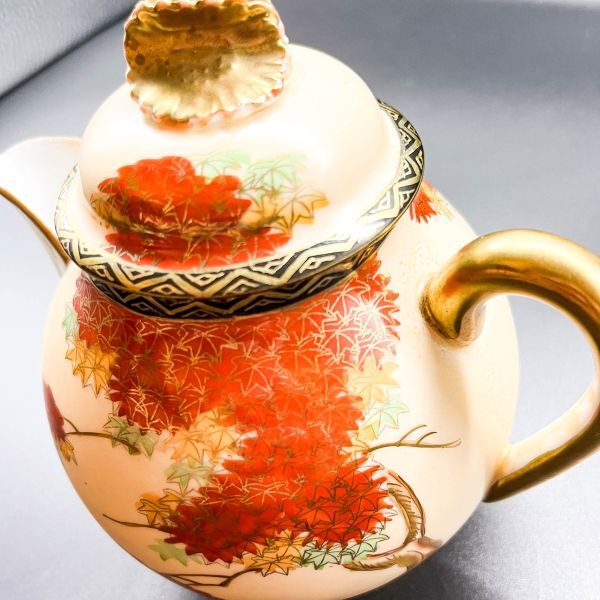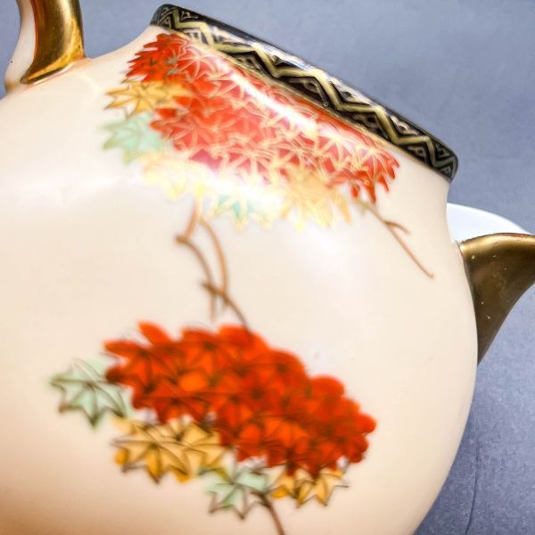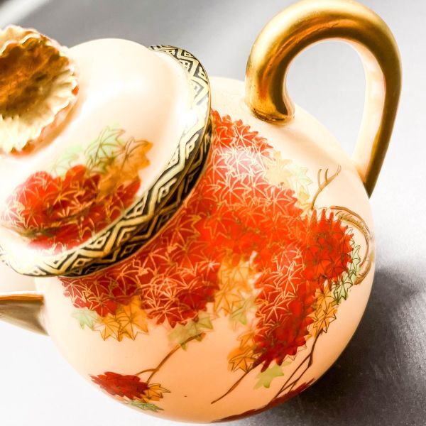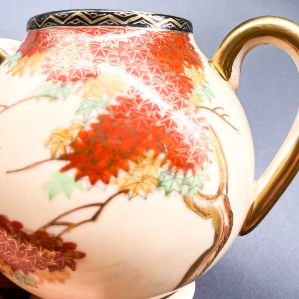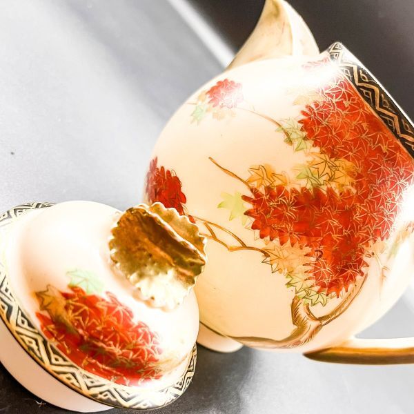 こちらは1950年代後半から1970年代前半にかけて日本で製造された九谷焼系の輸出用陶磁器で、伝統的な金彩赤絵技法と紅葉図柄が特徴です。熟練職人による繊細な筆致と豪華な金彩装飾は、日本の美意識と高度な焼物技術を象徴しており、欧米市場でも高く評価されました。ティーポット、シュガーポット、ミルクジャグの揃いは当時の輸出品の中でも希少で、和の趣と実用性を兼ね備えた逸品です。