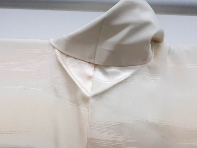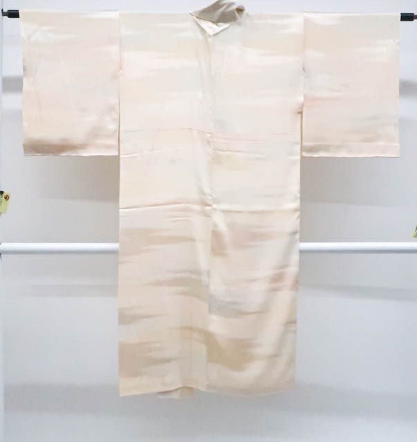 リサイクル商品のため、右衽に文字、衿にシミがございますが着用可能なお品です。 広衿、袷仕立てです。 地色は、薄橙色です。 1枚目の画像が近いお色かと思われます。 素材は正絹です。 |