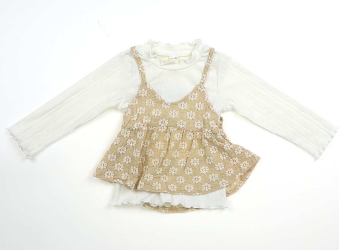 重ね着風デザイン・単品ではお使いいただけません。襟足部分内側に毛羽立ち・広範囲に襟ぐり下に黒ずみ汚れがあります。普段用にいかがでしょうか。