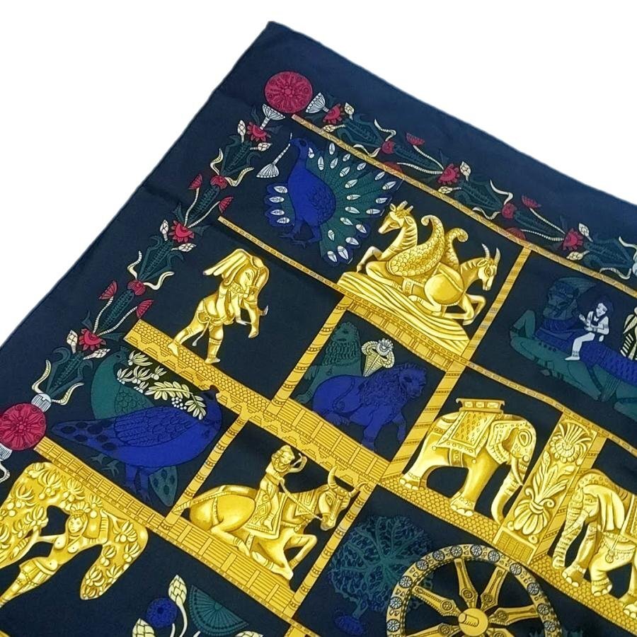 ・送料無料 美品 エルメス HERMES 大判スカーフ カレ90 TORANA 塔門 絹 シルク100% 仏製 フランス製 紺 ネイビー系 レディース