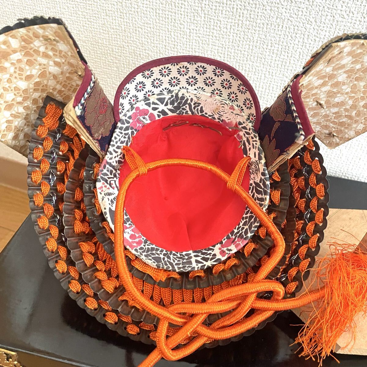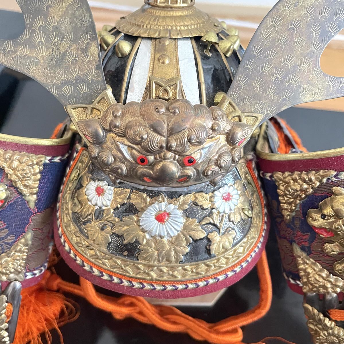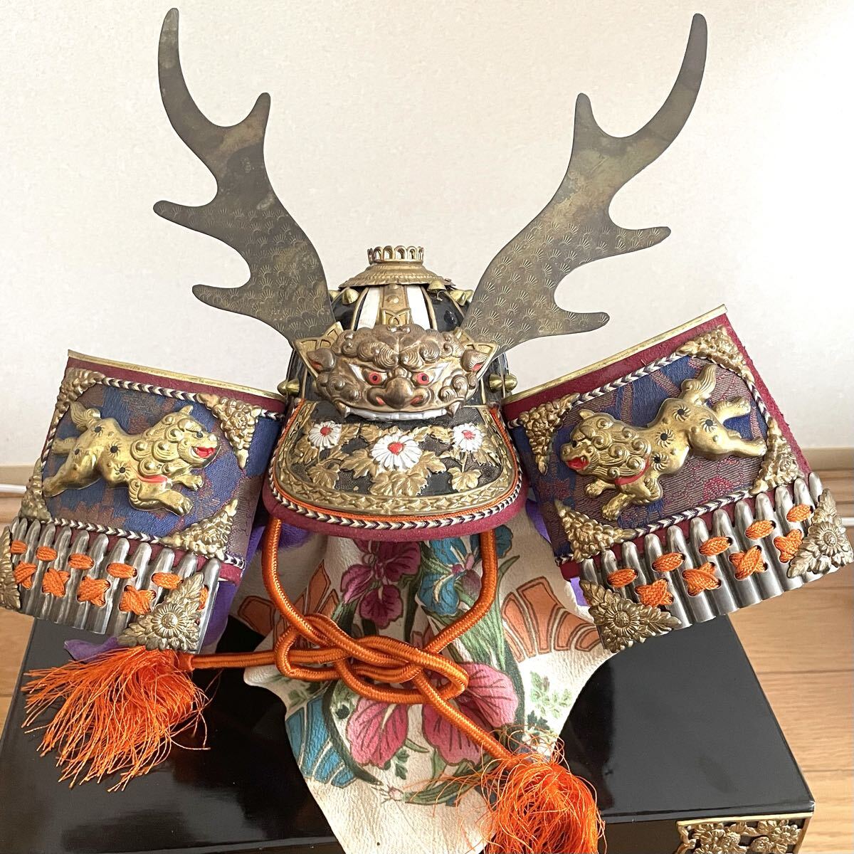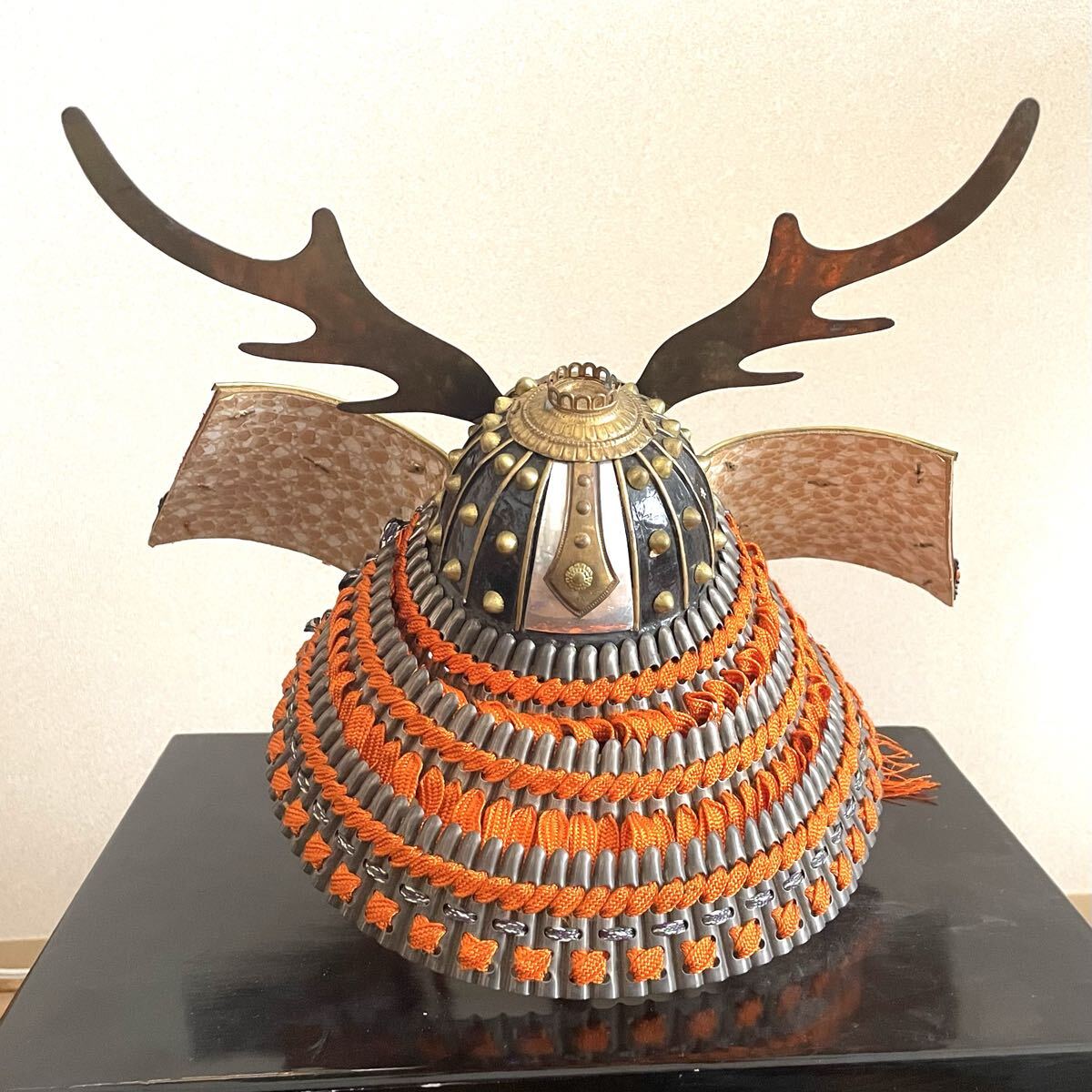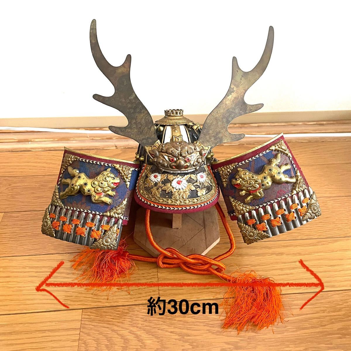 何十年も前の兜です。金属部分は経年劣化で色がくすんでいます。