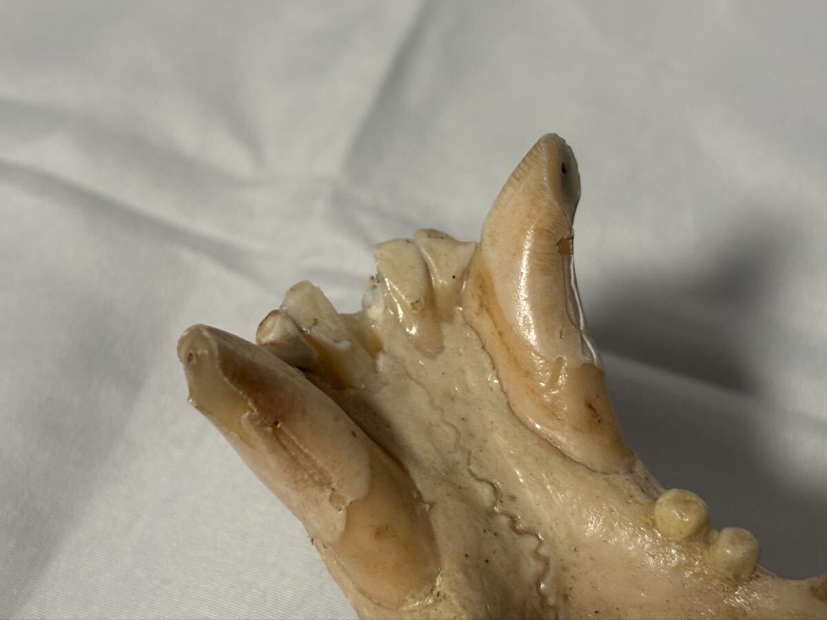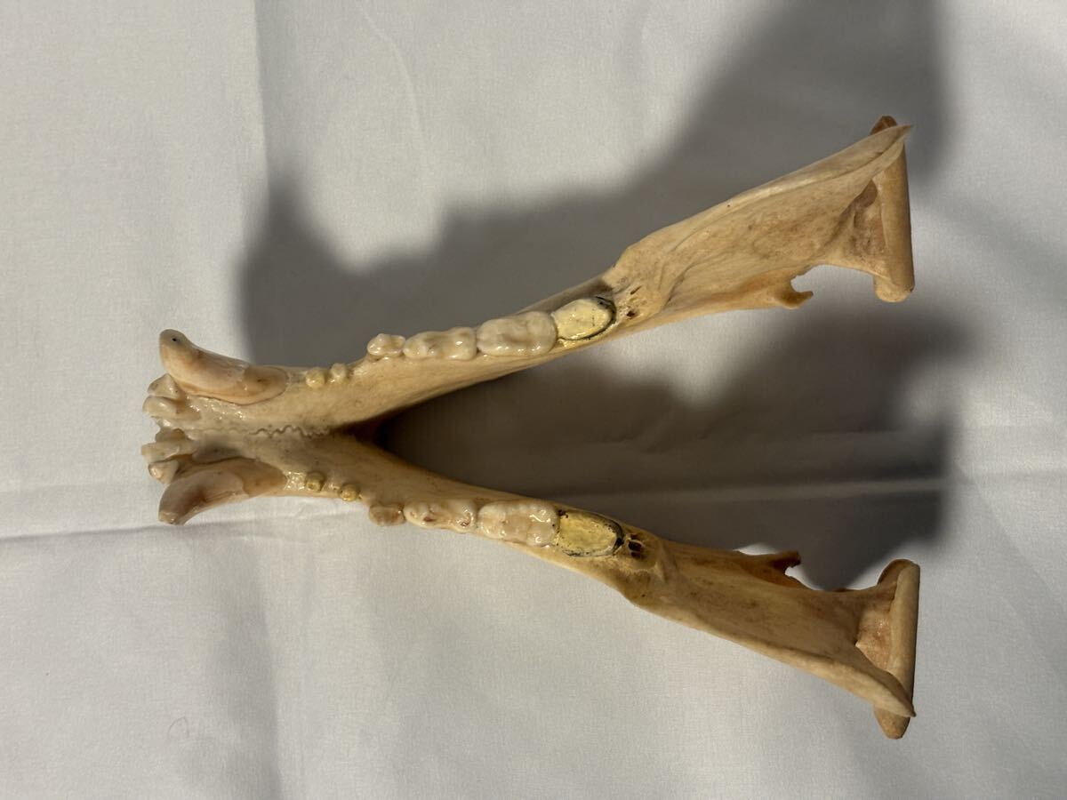 状態:下顎切歯2本折れ、鼻甲介欠損、後頭顆に線状の傷あり。