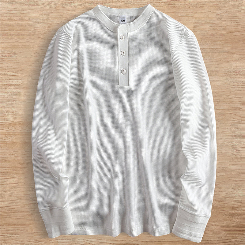Y6304-L ホワイト 新品 ヘンリーネック Tシャツ 肌に優しい ワッフル 長袖 通気 ウォッシュ加工 サマー 秋 カジュアル トップス 高品質