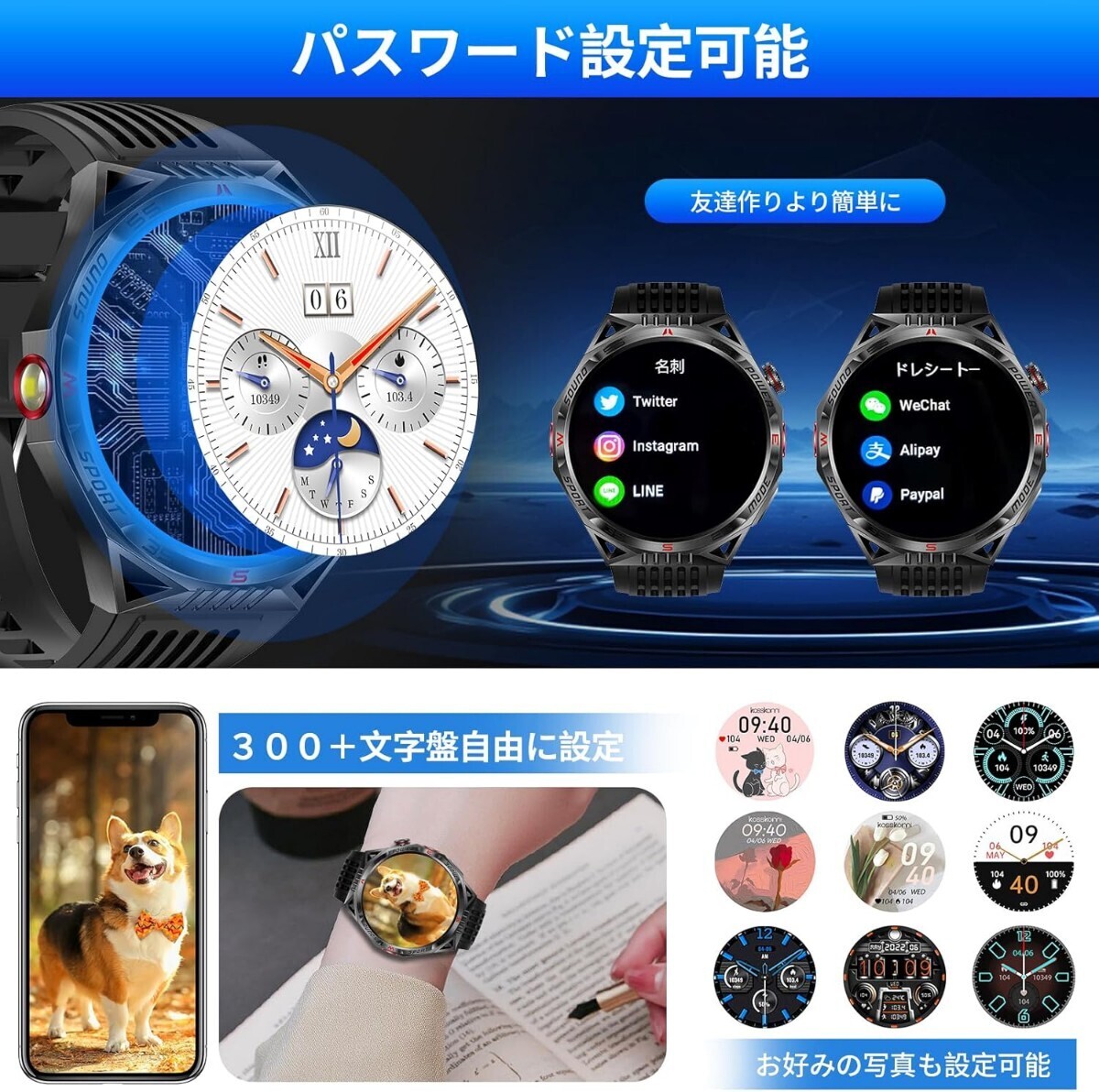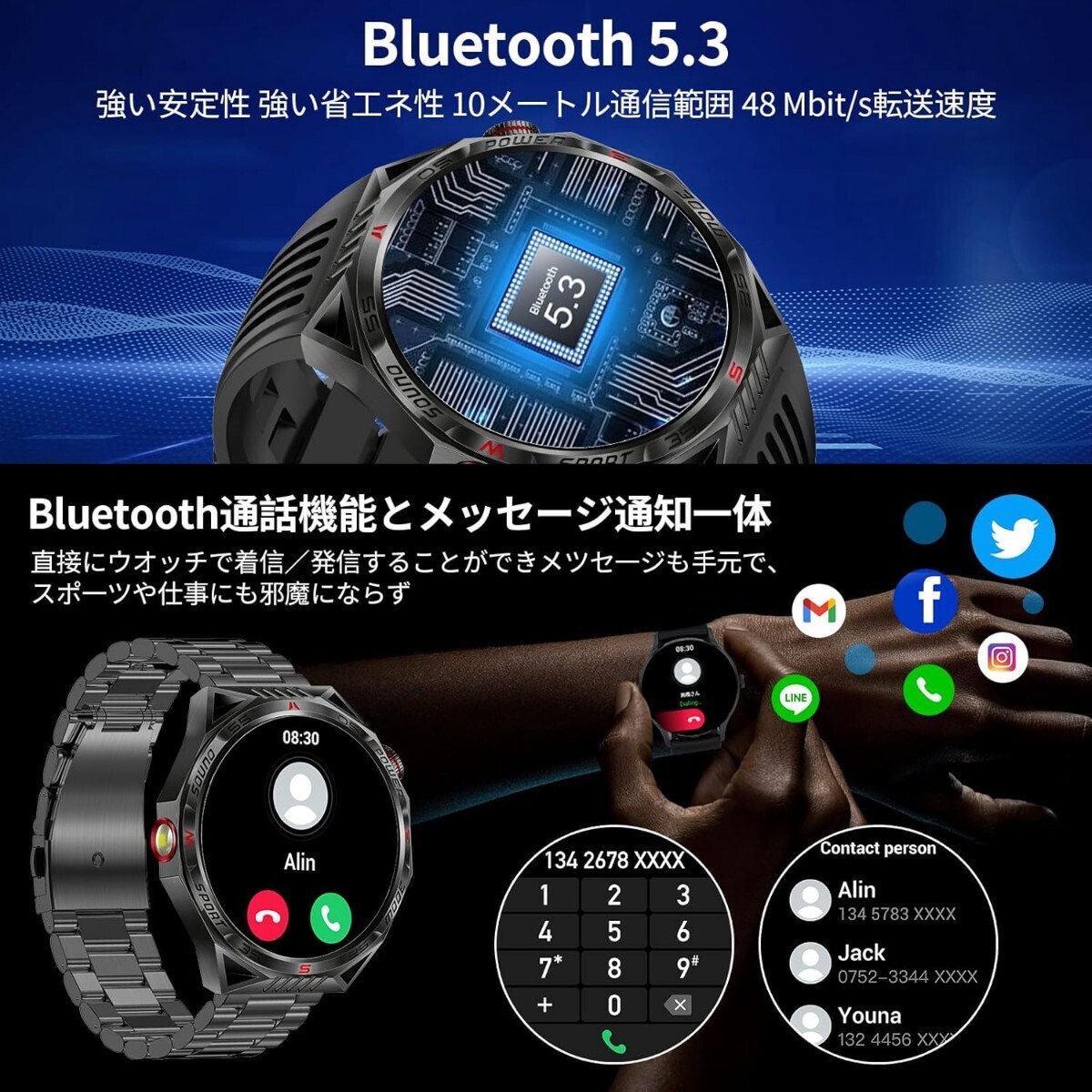 • 【Bluetooth5.3 ・Bluetooth通話機能付き・メッセージ通知・音声アシスタント・音楽コントロール・カメラ付き・スマホ探し】