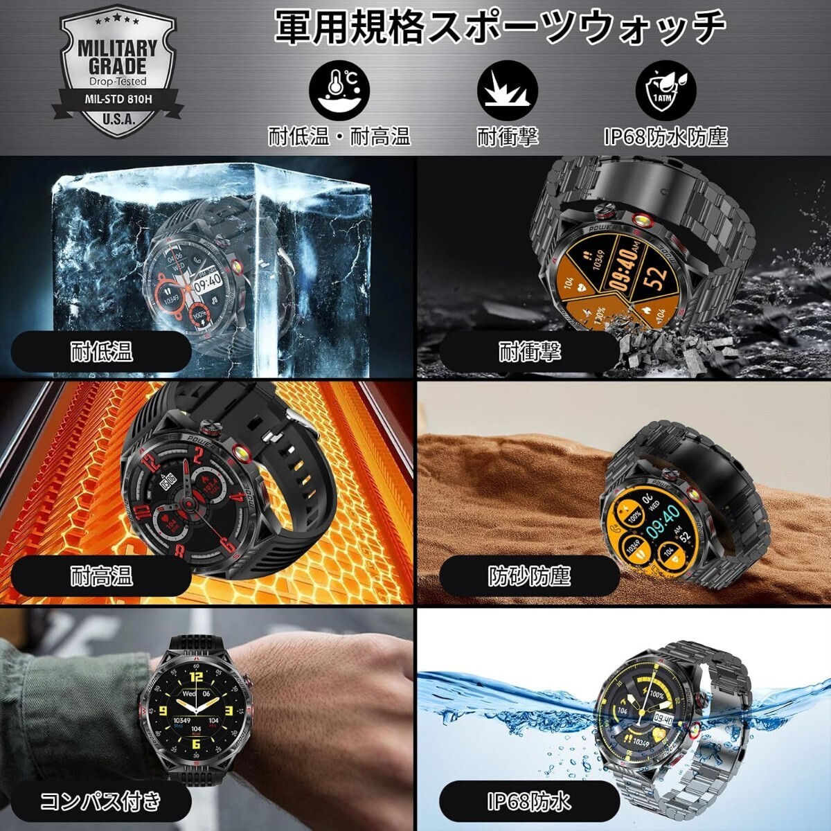 • 機能的でありながら一流でしか味わえない魅力のあるデザインは時代が進んだとしても長く愛される軍用スマートウォッチてす。長年の使用にも耐えられる設計です。またに、SUS304ステンレス鋼なボデイで強度と耐食性・耐久性、耐熱性に優れています。