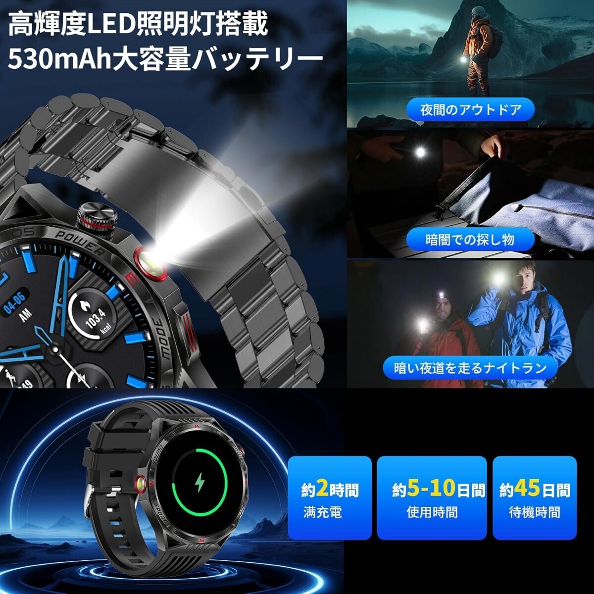 • 【軍用規格・高輝度懐中電灯付き・IP68防水防塵・驚きの530mAh超大容量バッテリー・300+ウォッチフェイス】