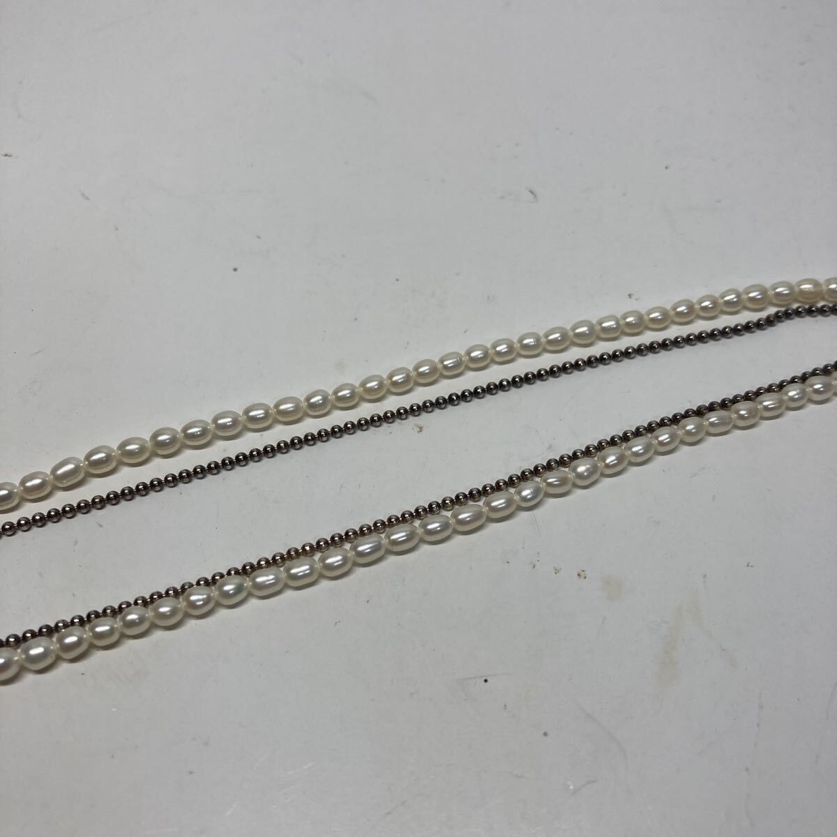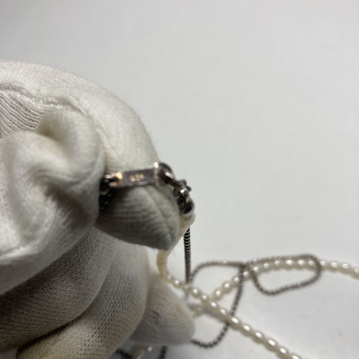 こちらは珍しい2連のネックレスでシルバーチェーンとのコラボネックレスでございます。玉は小さいですが照りがございます。糸に関しては消耗品につき気になる場合にはご自身でメンテナンスをお願いします。