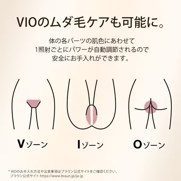 サロンで肌の色に合わせてパワーを調節するように、ブラウン光美容器は1秒間に80回肌の色を読み込んで、1照射ごとにパワーを10段階から自動調節するので、おうちでも特別な設定なしで安全にムダ毛ケアが可能。顔やVIOなどのデリケートな部位にも使用可能です。