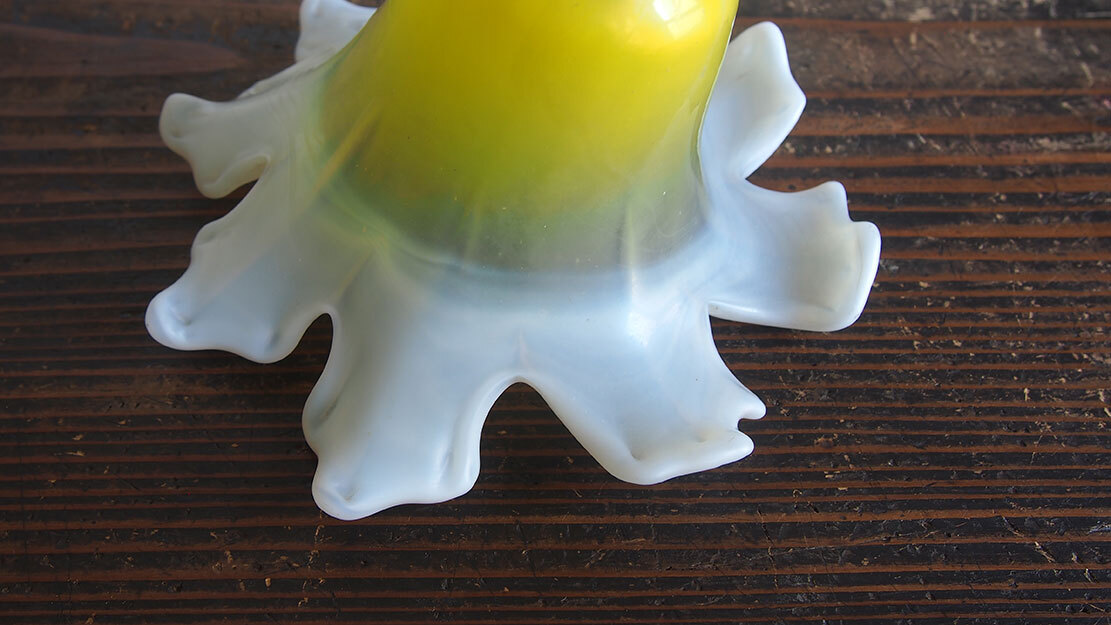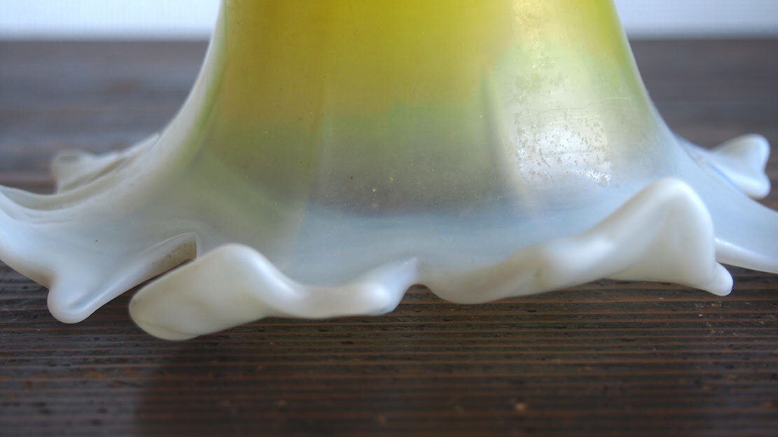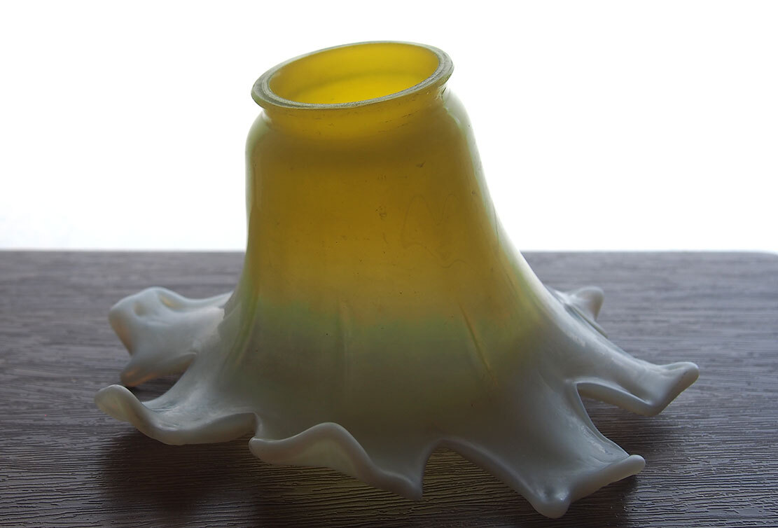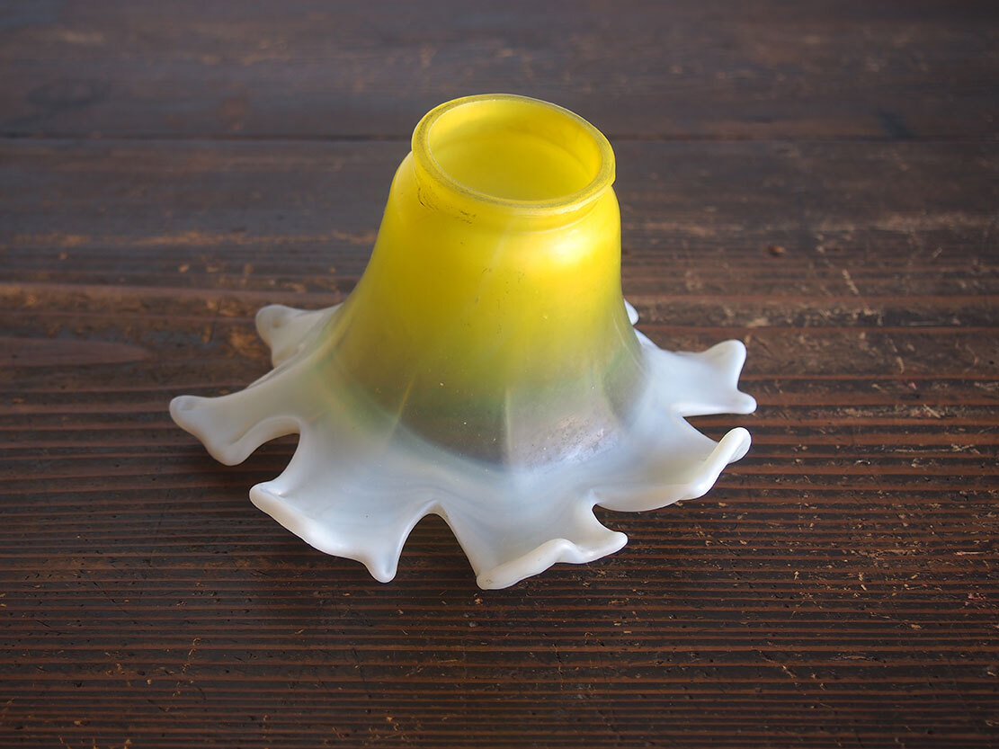 磨りガラス オパールセント アールデコ フリルガラス ランプシェード電笠 直径18cm 大正ロマン ヨーロッパ フランスアンティーク/K173 ●サイズ:高10.7cm, 直径18cm 344g ●材質:ガラス ヨーロッパのアンティーク市にて入手、1930年ぐらい? 百合の花のような形の美しいハンドメイドのガラスシェード。傾いているのは歪みではなく、このようなデザインです。ソケット挿入口外径5.6cm くびれ部分外径4.8cm くびれ部分内径4.5cm。特に目立つダメージの無い良い状態のものです。フリルの部分に短く細かい傷のようなものがありますが、これは製造過程でできたもののようです。日本の規格のソケットE26がご利用いただけます。参考資料、リメイクなどにどうぞ。 詳細は写真でご確認いただけます。古い物だと言う事をご理解の上のご入札をお願い致します。材質及び年代の判定は困難な場合があります、差異についてはあらかじめご了承下さい。 ー ー ー ー ー ー ー ー ー 記載にない方法での発送はいたしません。 発送をお急ぎのお客様にはご希望に添えない場合があります。 ー ー ー ー ー ー ー ー ー ●その他 ヤフオクの小さな写真では商品を詳細にご覧頂く事ができません。リンク写真で質感ダメージ等の写真を数多くアップしています。必ず全部の写真がよく見える環境でご覧下さい。本商品は時代を経た古い物です。写真や説明で記載できないようなキズやシミ、古い物特有の臭いのある物もあります。できる限り詳細に説明するよう努力しておりますが、ご理解頂ける方、神経質で無い方、埃によるアレルギー等の無い方のご入札をお願いします。 必ず当店の自己紹介欄と落札後の落札通知をご覧下さい。 土曜日曜日は基本的には定休日です。メール、質問への回答は月曜日にいたします。 ご連絡は落札後48時間以内にお願いします。ご連絡が無い場合はお客様都合によるキャンセルとさせて頂きます。落札から1週間(土日祝日含む)経過してもご入金が無い場合も同様といたします。ご注意下さい。 特に評価「0」の新規のお客様、および 私とのお取り引きが初めてのお客様は遅れる事の無い様にお願い申し上げます。 評価の悪いお客様のご入札は取り消す場合があります。 入札の取り消しおよびキャンセルは固くお断りいたします。 自己紹介欄には急な連絡事項等も記載してあります、ご入札前に必ずご覧下さい。落札後には『落札通知』の内容も必ずご確認ください。 当オークションをご覧下さりありがとうございました。 Accept Paypal payment |