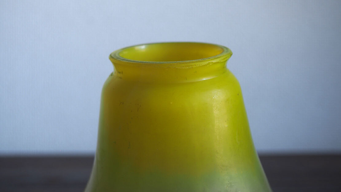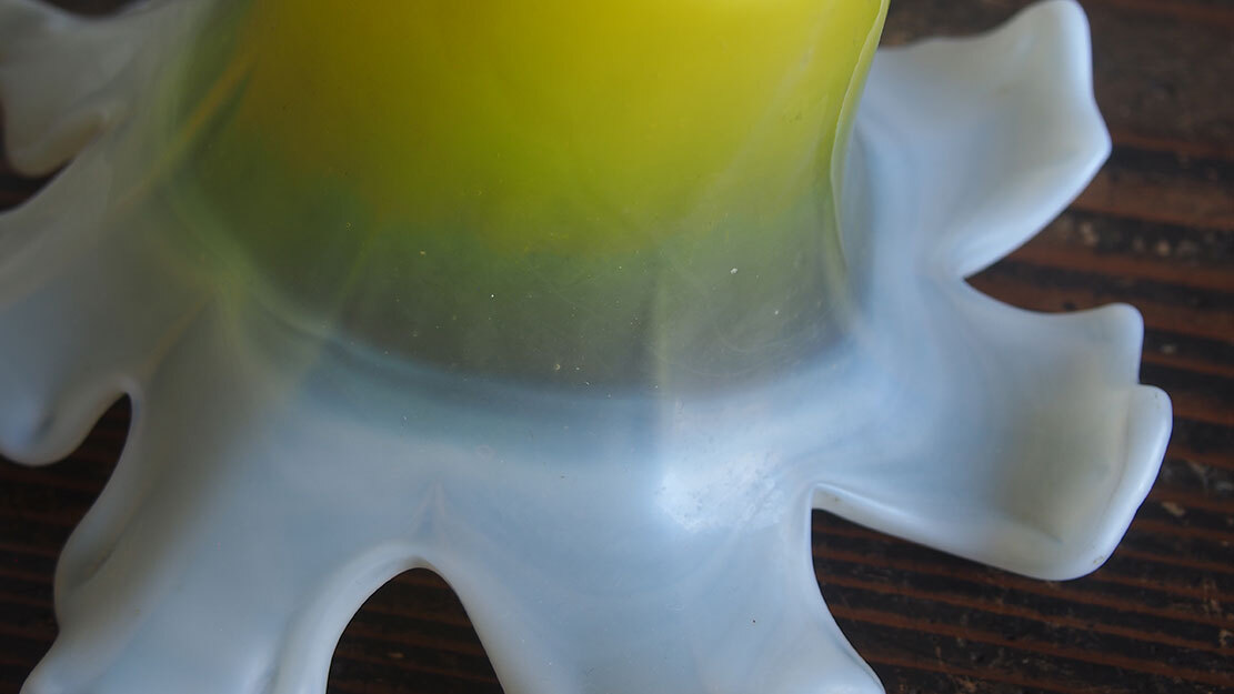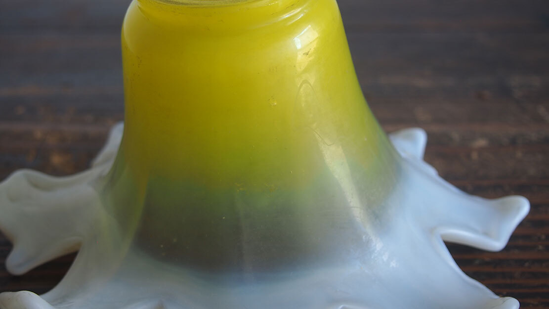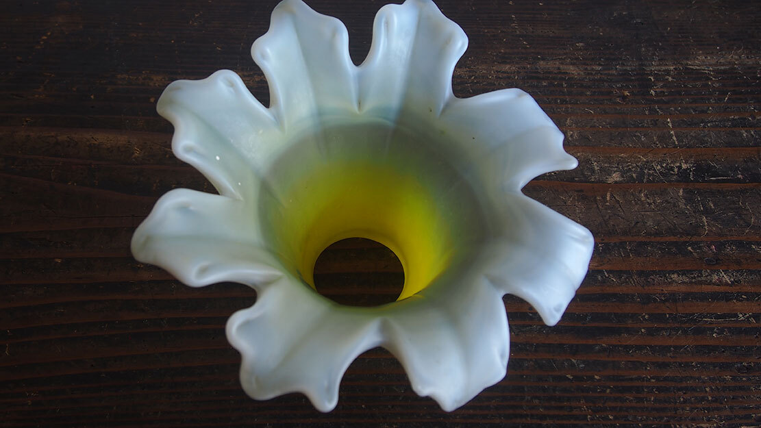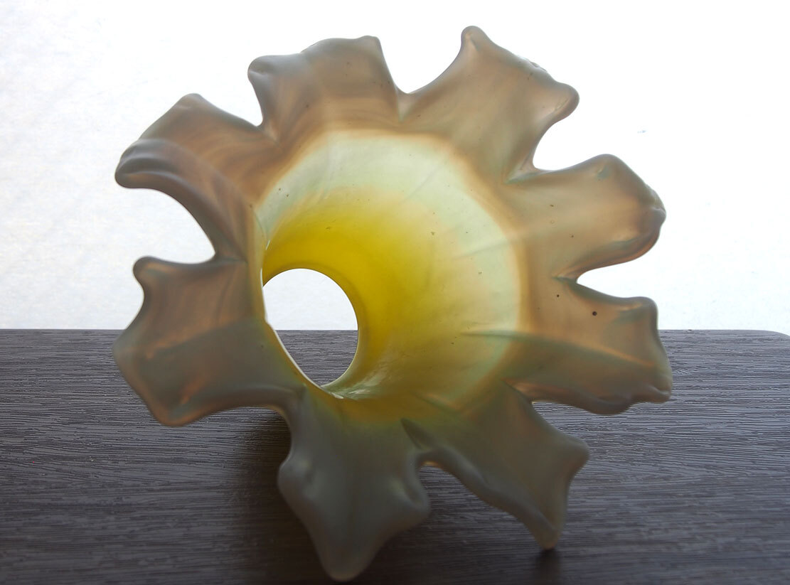 磨りガラス オパールセント アールデコ フリルガラス ランプシェード電笠 直径18cm 大正ロマン ヨーロッパ フランスアンティーク/K173 ●サイズ:高10.7cm, 直径18cm 344g ●材質:ガラス ヨーロッパのアンティーク市にて入手、1930年ぐらい? 百合の花のような形の美しいハンドメイドのガラスシェード。傾いているのは歪みではなく、このようなデザインです。ソケット挿入口外径5.6cm くびれ部分外径4.8cm くびれ部分内径4.5cm。特に目立つダメージの無い良い状態のものです。フリルの部分に短く細かい傷のようなものがありますが、これは製造過程でできたもののようです。日本の規格のソケットE26がご利用いただけます。参考資料、リメイクなどにどうぞ。 詳細は写真でご確認いただけます。古い物だと言う事をご理解の上のご入札をお願い致します。材質及び年代の判定は困難な場合があります、差異についてはあらかじめご了承下さい。 ー ー ー ー ー ー ー ー ー 記載にない方法での発送はいたしません。 発送をお急ぎのお客様にはご希望に添えない場合があります。 ー ー ー ー ー ー ー ー ー ●その他 ヤフオクの小さな写真では商品を詳細にご覧頂く事ができません。リンク写真で質感ダメージ等の写真を数多くアップしています。必ず全部の写真がよく見える環境でご覧下さい。本商品は時代を経た古い物です。写真や説明で記載できないようなキズやシミ、古い物特有の臭いのある物もあります。できる限り詳細に説明するよう努力しておりますが、ご理解頂ける方、神経質で無い方、埃によるアレルギー等の無い方のご入札をお願いします。 必ず当店の自己紹介欄と落札後の落札通知をご覧下さい。 土曜日曜日は基本的には定休日です。メール、質問への回答は月曜日にいたします。 ご連絡は落札後48時間以内にお願いします。ご連絡が無い場合はお客様都合によるキャンセルとさせて頂きます。落札から1週間(土日祝日含む)経過してもご入金が無い場合も同様といたします。ご注意下さい。 特に評価「0」の新規のお客様、および 私とのお取り引きが初めてのお客様は遅れる事の無い様にお願い申し上げます。 評価の悪いお客様のご入札は取り消す場合があります。 入札の取り消しおよびキャンセルは固くお断りいたします。 自己紹介欄には急な連絡事項等も記載してあります、ご入札前に必ずご覧下さい。落札後には『落札通知』の内容も必ずご確認ください。 当オークションをご覧下さりありがとうございました。 Accept Paypal payment |