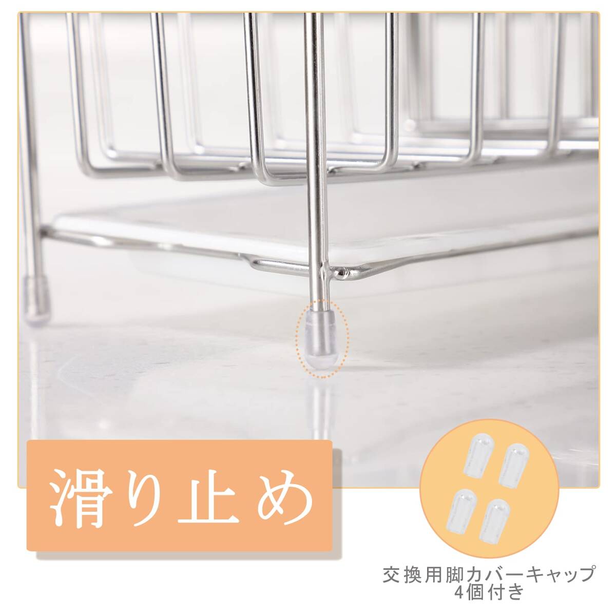【滑り止め】底部の4個の足に滑り止めシリコン製の脚カバーキャップ付いて、直接に流し台に置いても、カビ水垢がつくことを防ぎます。受け部が高い位置にあるので通気性がよく衛生的で、水切れも抜群(交換用のシリコン製脚カバーキャップが4個付きます)。