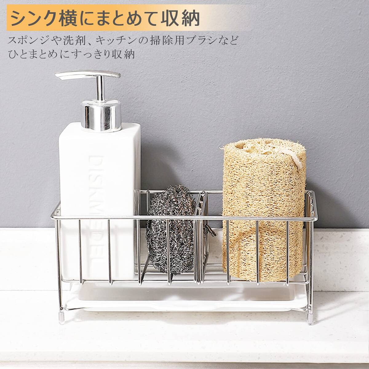 【省スペース】サイズ:21(長さ)*8.6(幅)*9cm(高さ)。ちょうどいいサイズで、流し台の水栓周りに対応できます。 シンク横に置いて、スポンジや洗剤ボトル、マグボトルブラシやシンクの掃除ブラシまで、まとめて一括収納。流し台の水栓周り、窓辺スペースのちょっとした空間を有効利用できます。シンクだけでなくお風呂場でも使える。