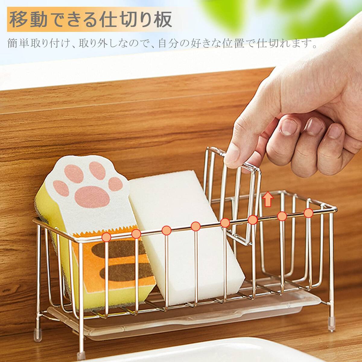 【取外し可能なトレー付き】底部に移動可能な小さいプラスチック製トレーがあります。使用後のスポンジや雑巾に残している水を収集でき、スポンジなどを乾かしてくれる同時に、洗面所や台所はいつでも乾燥的に。(ご注意:カビや水垢がつきないように定期的に掃除してください。)