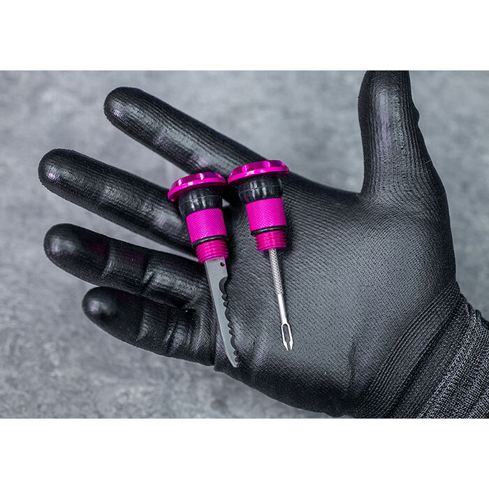 ステンレススチール製のパンクチャープラグ(リーマー)とナイフツールがそれぞれ左右に収納可能。
