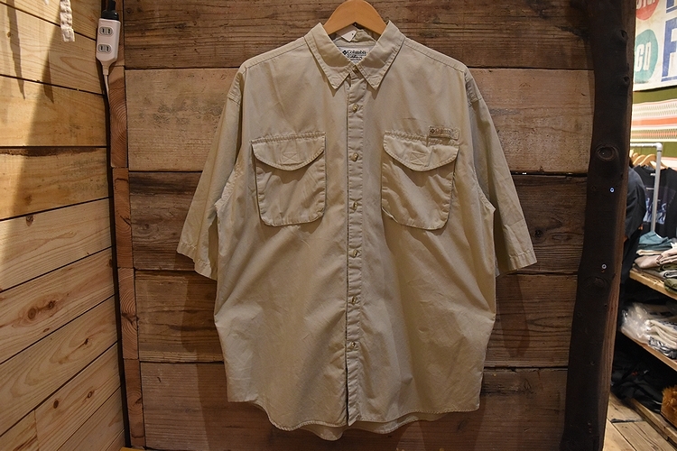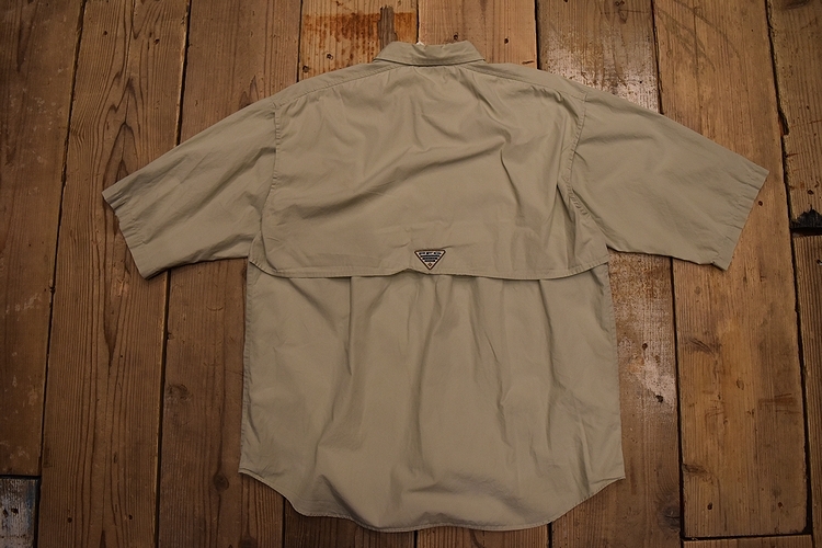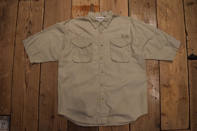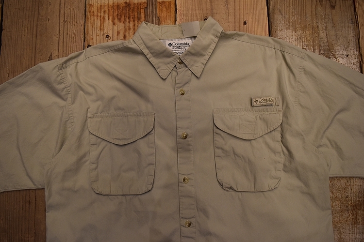 グッドスタイルアイテム◎90sビンテージColumbiaコロンビアPFG半袖コットンフィッシングシャツMグレー灰色系アメカジアウトドア t934