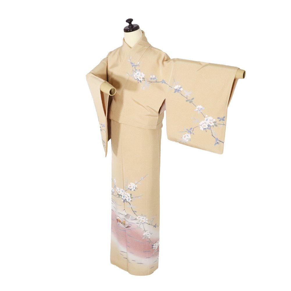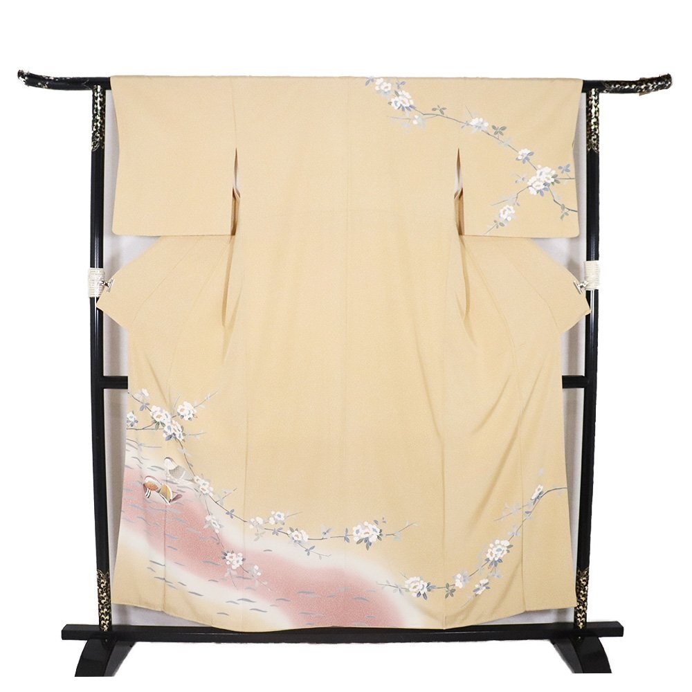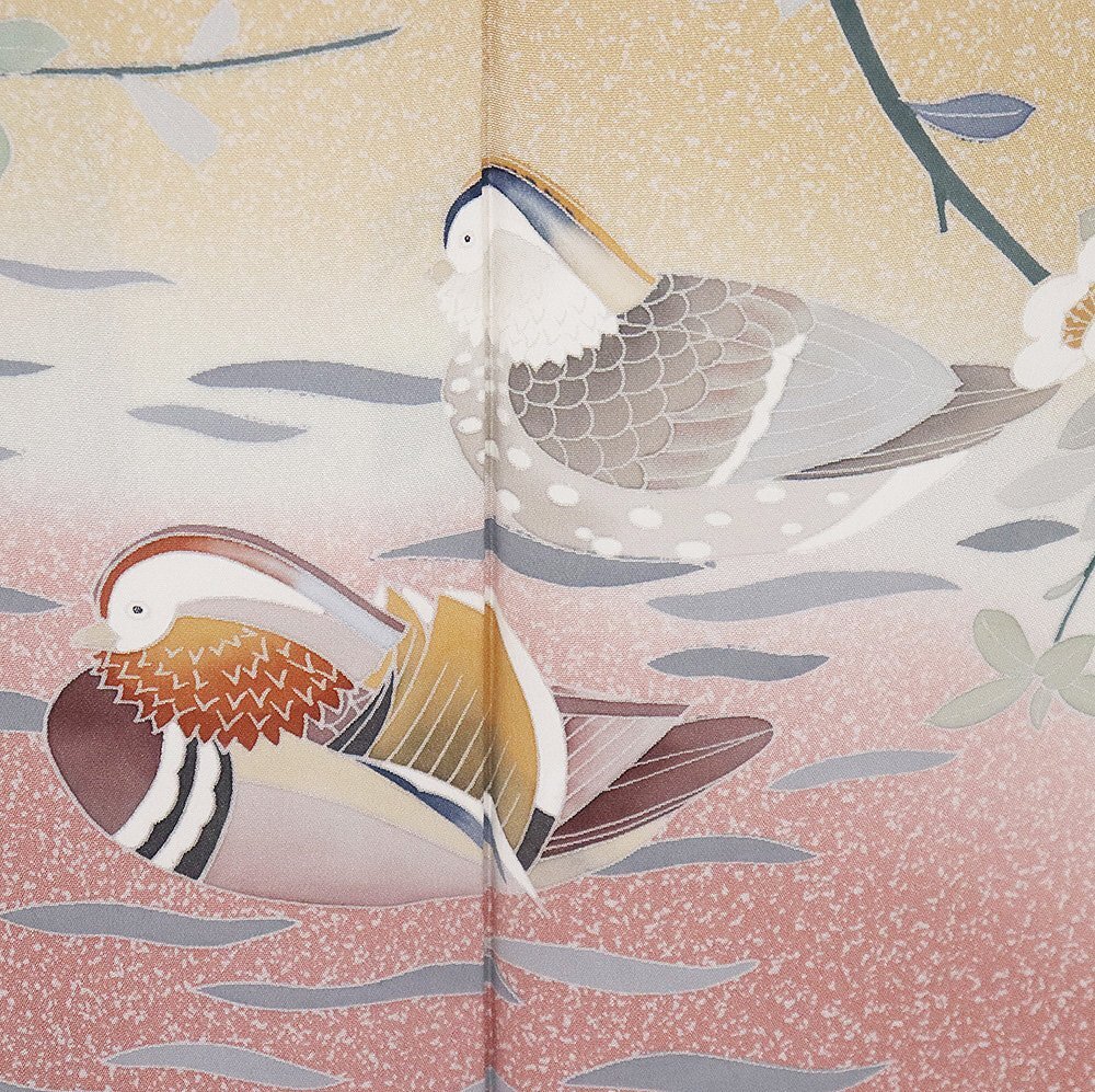 | 友禅訪問着 袷 丹後縮緬地 オレンジ(香色)・オフホワイト(象牙色)・赤紫(韓紅色) ・暈し・時雨模様地 オシドリ・梅 161 広襟 作家落款入り | |