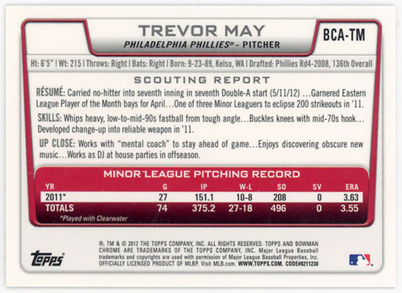 TWINS-METS-ATHLETICS△TREVOR MAY/2012 BOWMAN CHROME直書サインPROS!