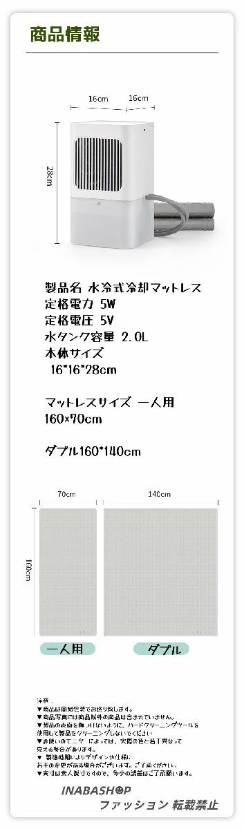 卓越な冷却効果:水冷床は水を循環させて体の熱を放散し、夏の夜の睡眠をより快適にします。使用する際は、本体をマットレスより高い位置に設置して、水の逆流を防止してください。