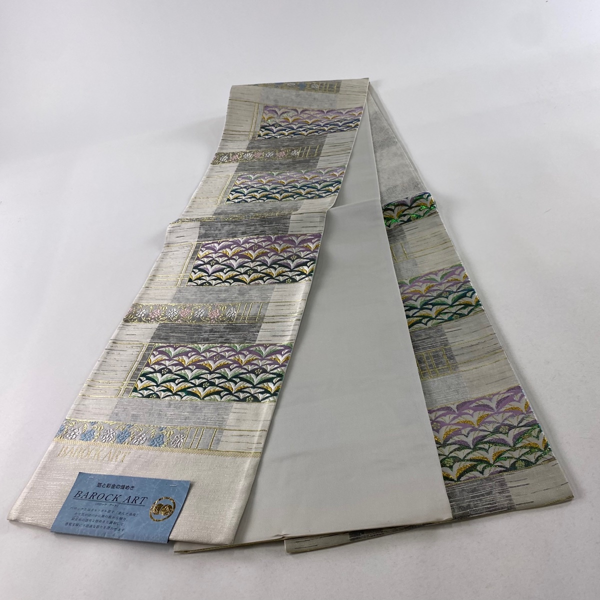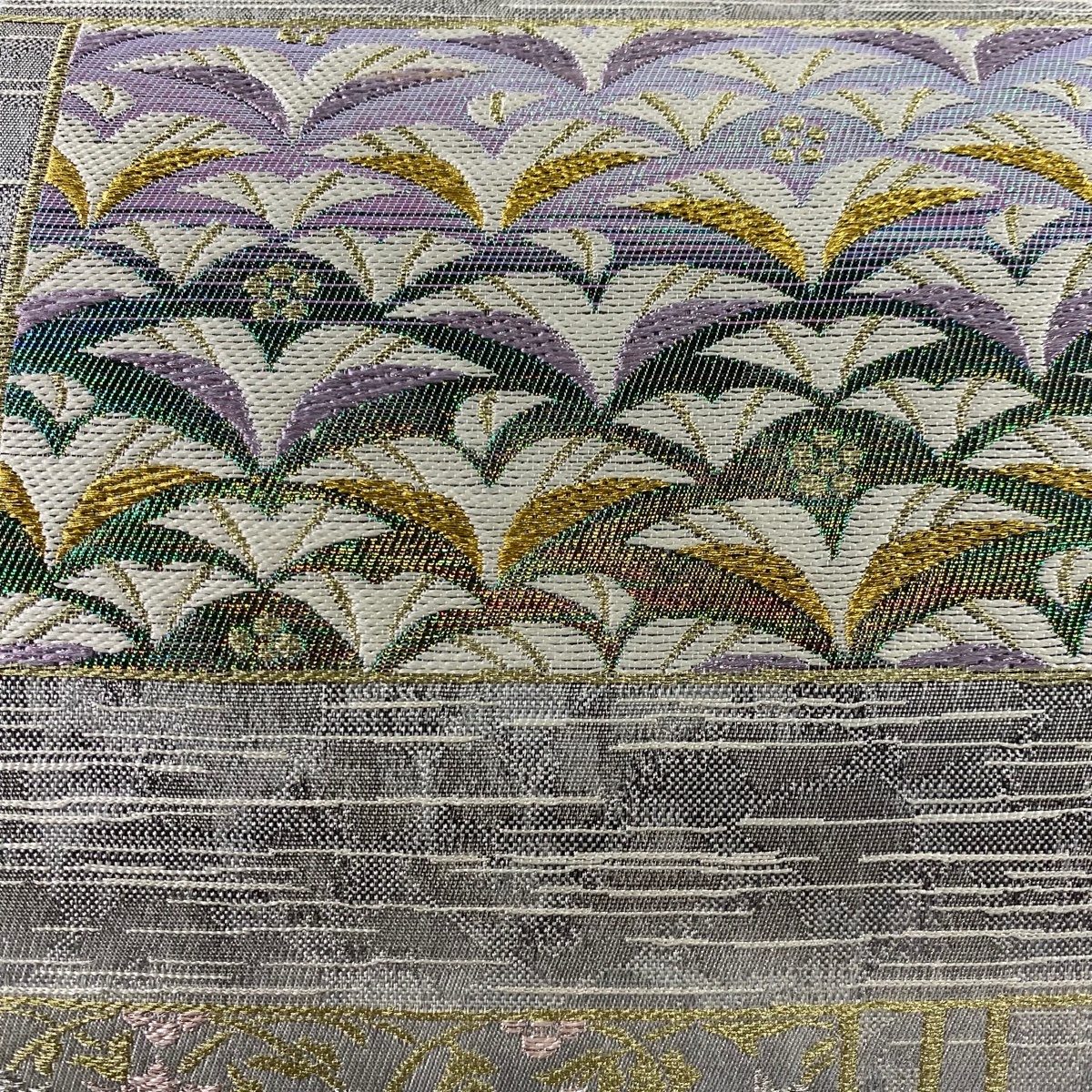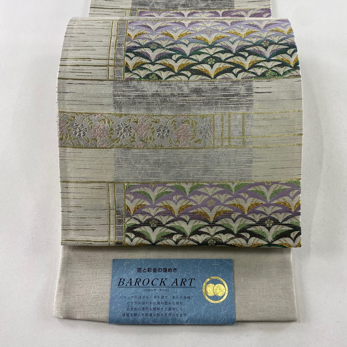 | 袋帯 美品 秀品 葉 花唐草 金銀糸 箔 灰白 六通 正絹 【中古】 |
