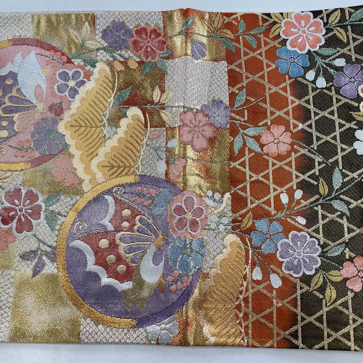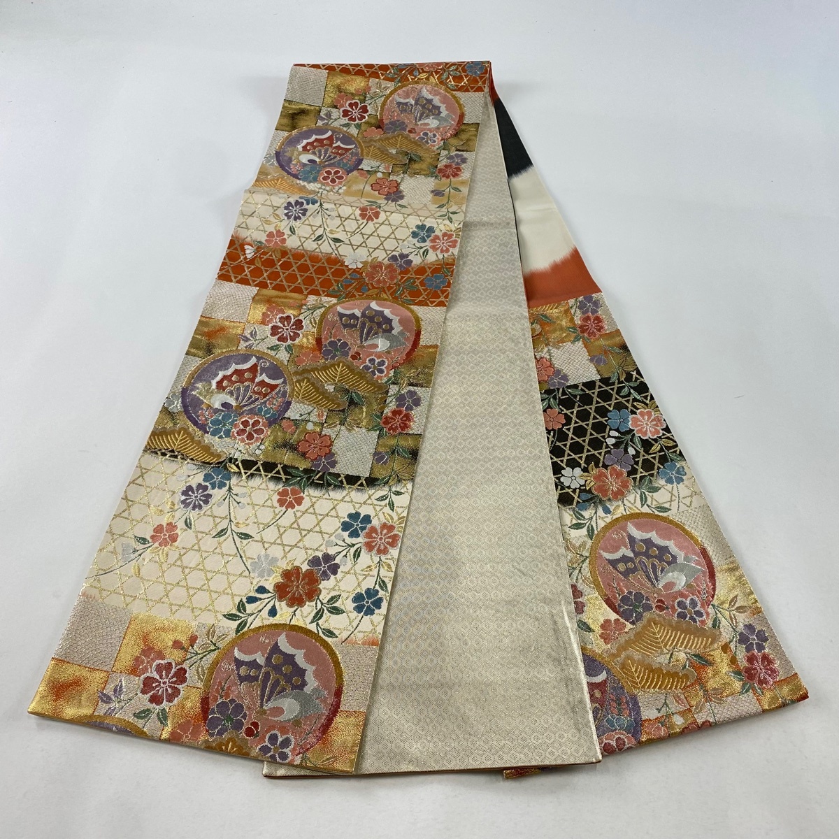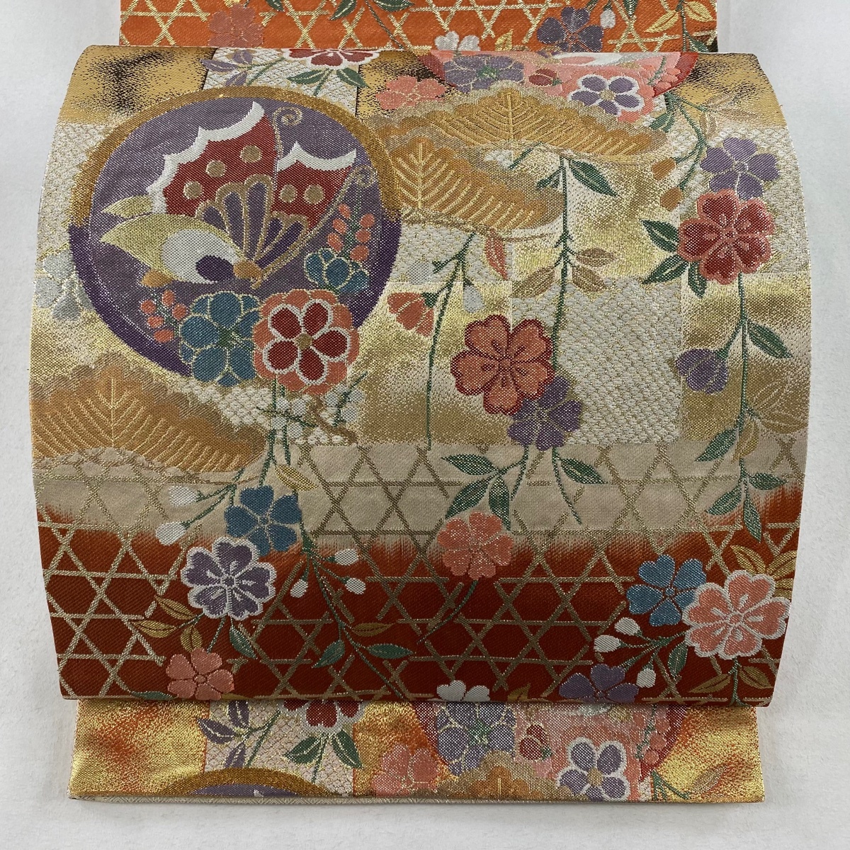 | 袋帯 美品 秀品 蝶 枝垂れ桜 金銀糸 箔 ベージュ 六通 正絹 【中古】 |