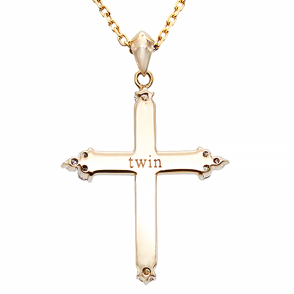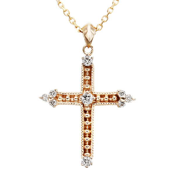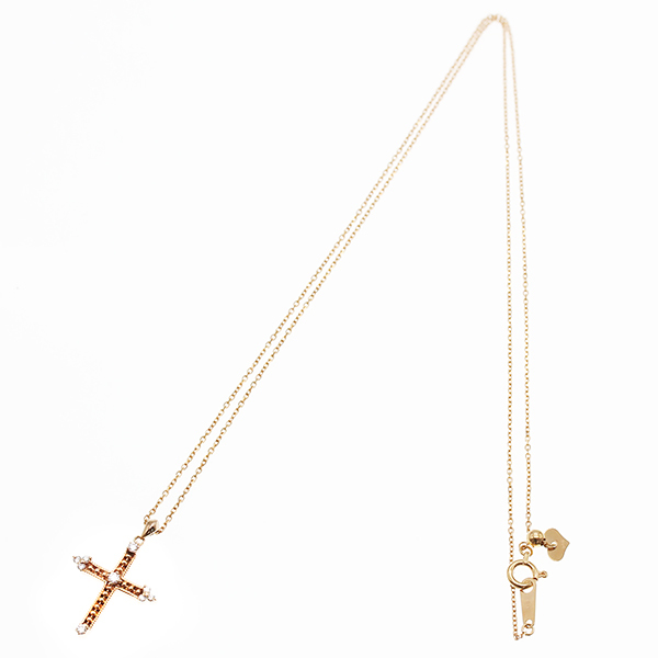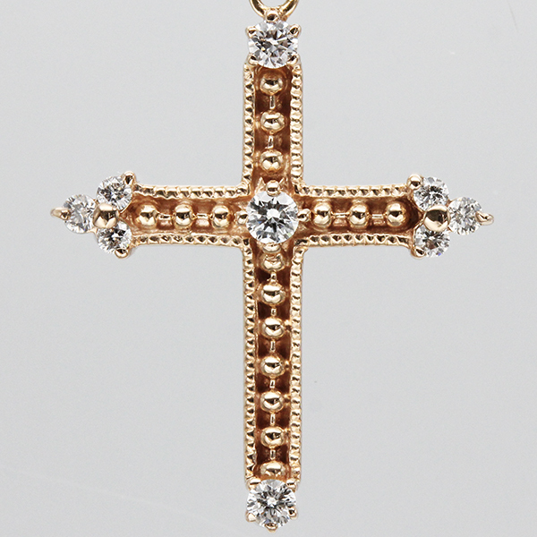 シンプルなクロスモチーフにダイヤモンドを5石セットしたカッコ可愛いデザインのネックレスです。ほんの少しゴシックな雰囲気もありカジュアルスタイルにピッタリなジュエリーです♪
