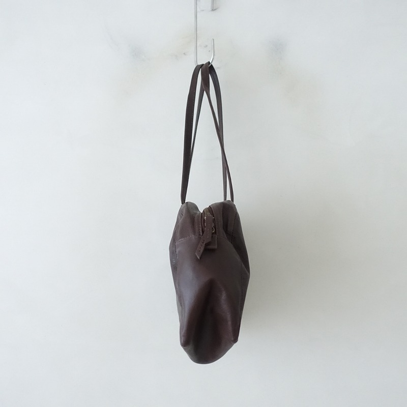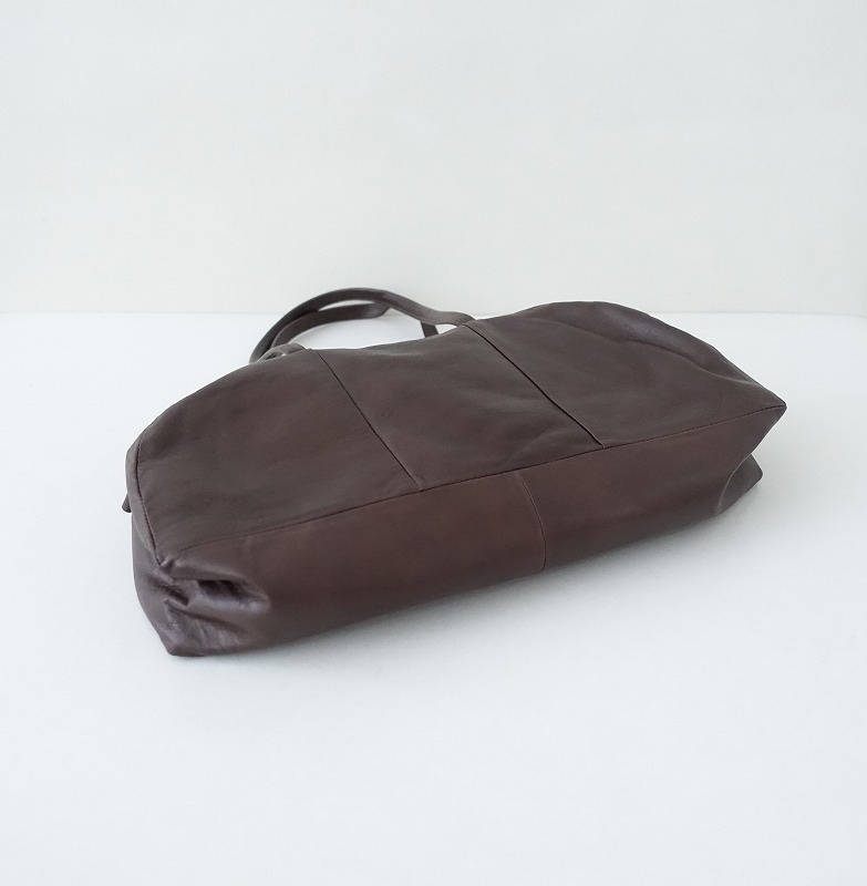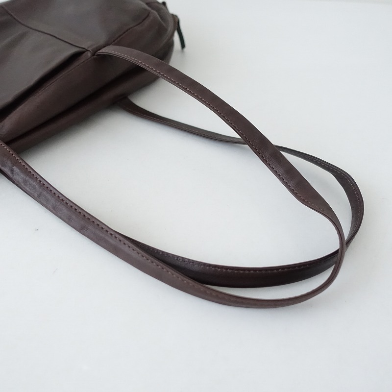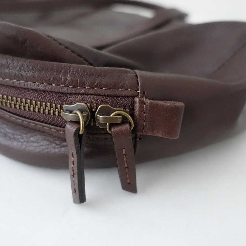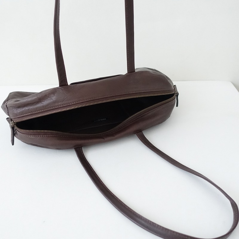 KURASHI & Trips PUBLISHINGの「がんばりどきも私らしく」一田憲子さんとつくったラウンドレザーバッグです。カラーはブラウンで素材はレザー、開口部はダブルジッパーです。外側にオープンポケットが1つ、内側は中綿入り&光沢感のあるダークブラウンの裏地とオープンポケットが3つあり、定価(メーカー希望小売価格)30,800円の商品です。 |