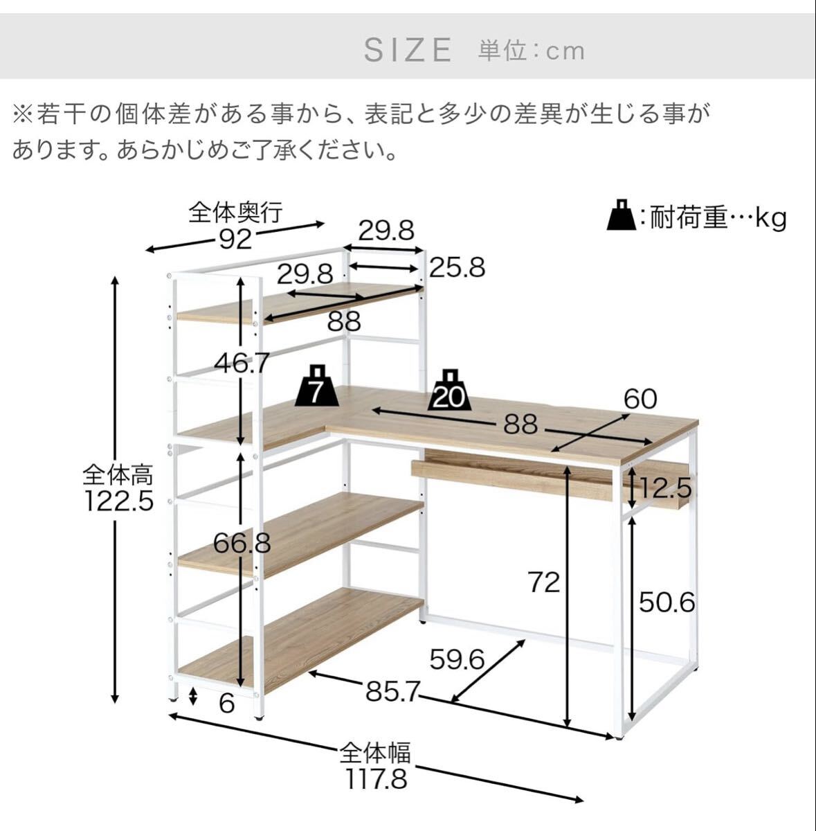 【重量】約31kg【耐荷重】デスク天板:約20kg、棚板:各約7kg【梱包サイズ】94x66x15cm(約34.5kg)