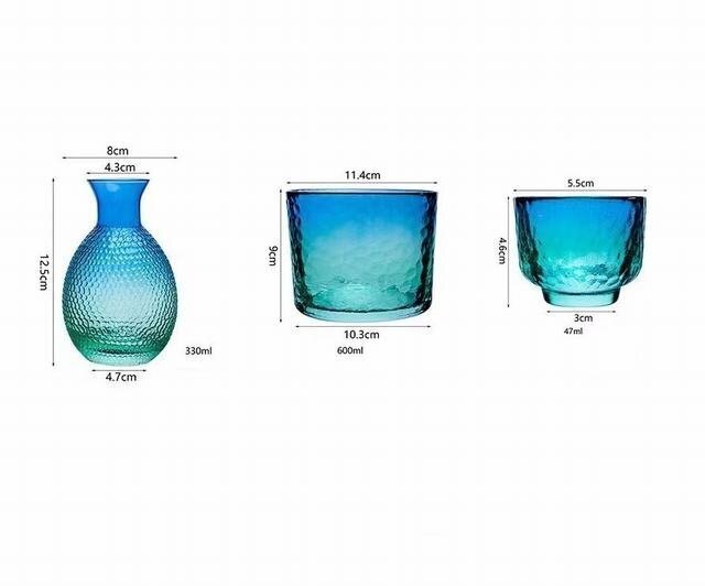 セット内容:徳利*1+おちょこ*4+燗器*1 素材:耐熱ガラス サイズ(約) 徳利:高さ12.5cm×幅さ5cm(口径:4.3cm) おちょこ:高さ8.8cm×幅さ10.5cm(口径:14.4cm)