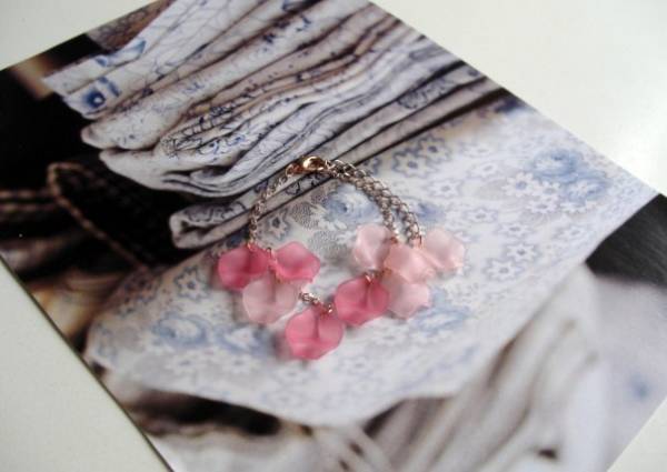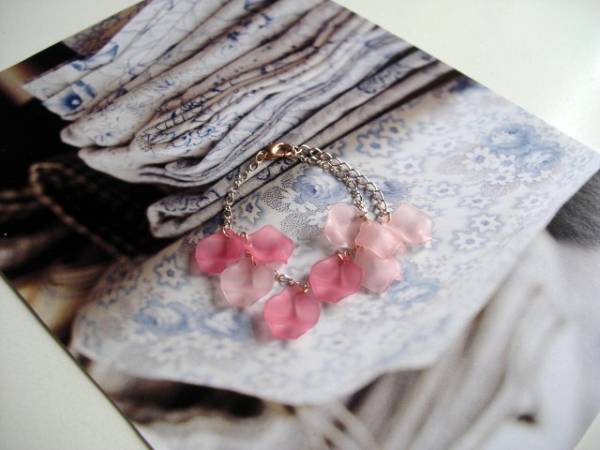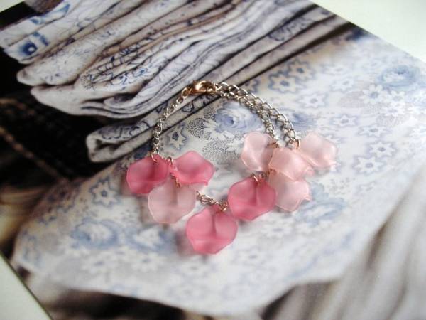 愛らしさのスパイス・・シリーズです♪やさしいピンク・・淡いピンク、大人っぽいサーモンピンクなど表情の違うピンクのアクリルの花びらのブレスレットです♪ピンクゴールドのチェーンを合わせてロマンチックしています♪長さは16センチ+アジャスター6センチで最長22センチ位です♪お揃いのネックレスやピアスも出品しています♪♪シンプルで飽きのこないいつまでも着けられるデザインを考えて作りました!ハンドメイドをご理解頂いてノークレーム、ノーリターンでお願いします