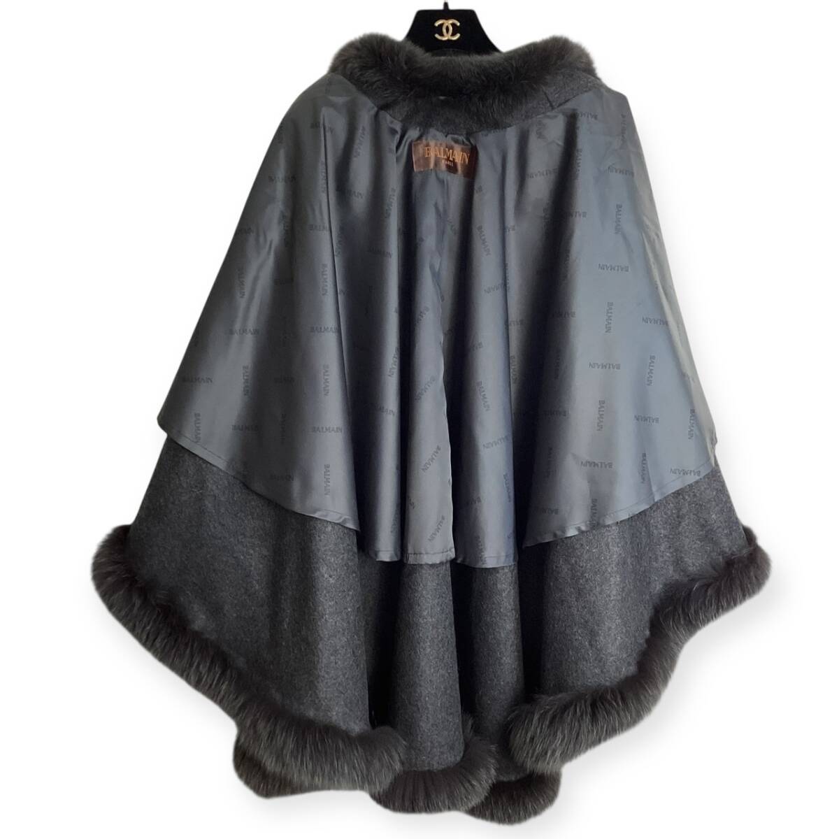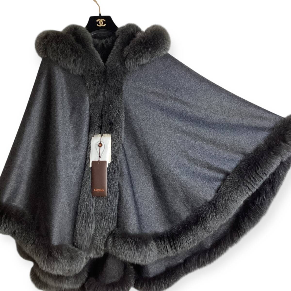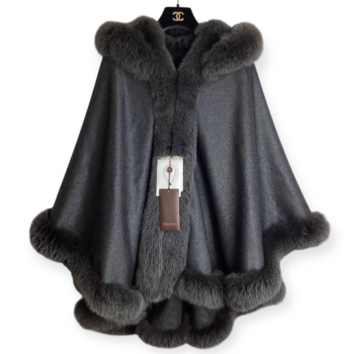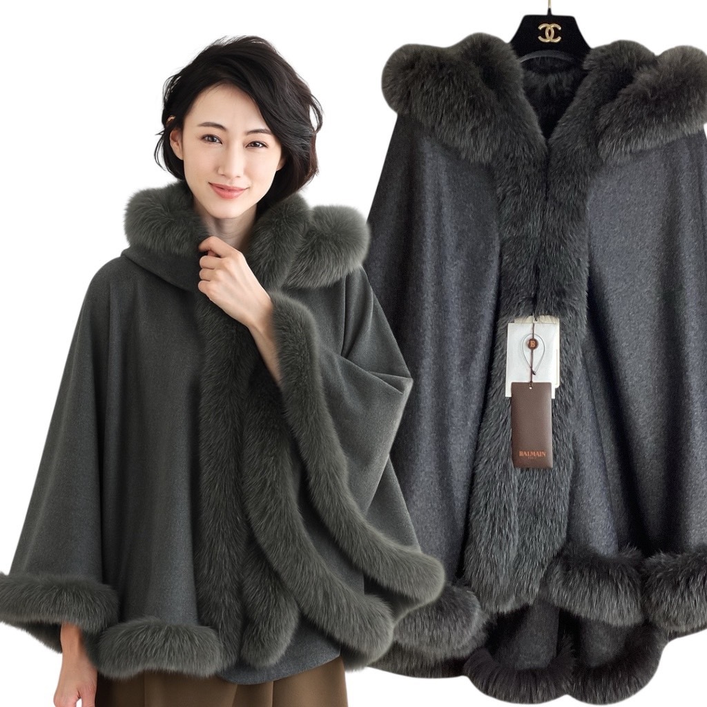 タグ付き☆カシミヤ&フォックスファー☆BALMAIN バルマン ポンチョ ケープ コート 毛皮 レディース フード グレー