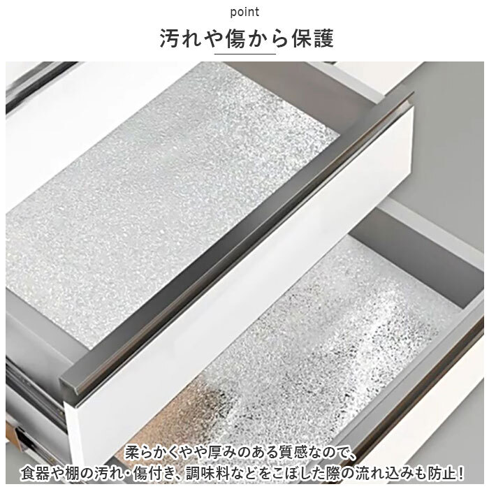 商品説明 | ・・様々な場所で活躍する保護シートが登場。 ・【耐熱仕様】 ・耐熱性のあるアルミ素材でコンロまわりなど、火気が心配な場所でも安心して使用可能。 ・【汚れや傷から保護】 ・柔らかくやや厚みのある質感なので、食器や棚の汚れ・傷付き、調味料などをこぼした際の流れ込みも防止! ・【お手入れラクラク】 ・汚れたら、サッと水拭きするだけでOK。 ・【方眼線付き】 ・台紙には方眼線が引かれてあるので、ハサミやカッターで簡単にカットすることが可能。 ・【キッチン以外でも】 ・靴箱やお部屋のキャビネット、クローゼットの引き出しなどにも。 |