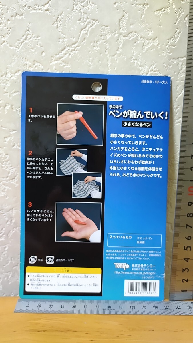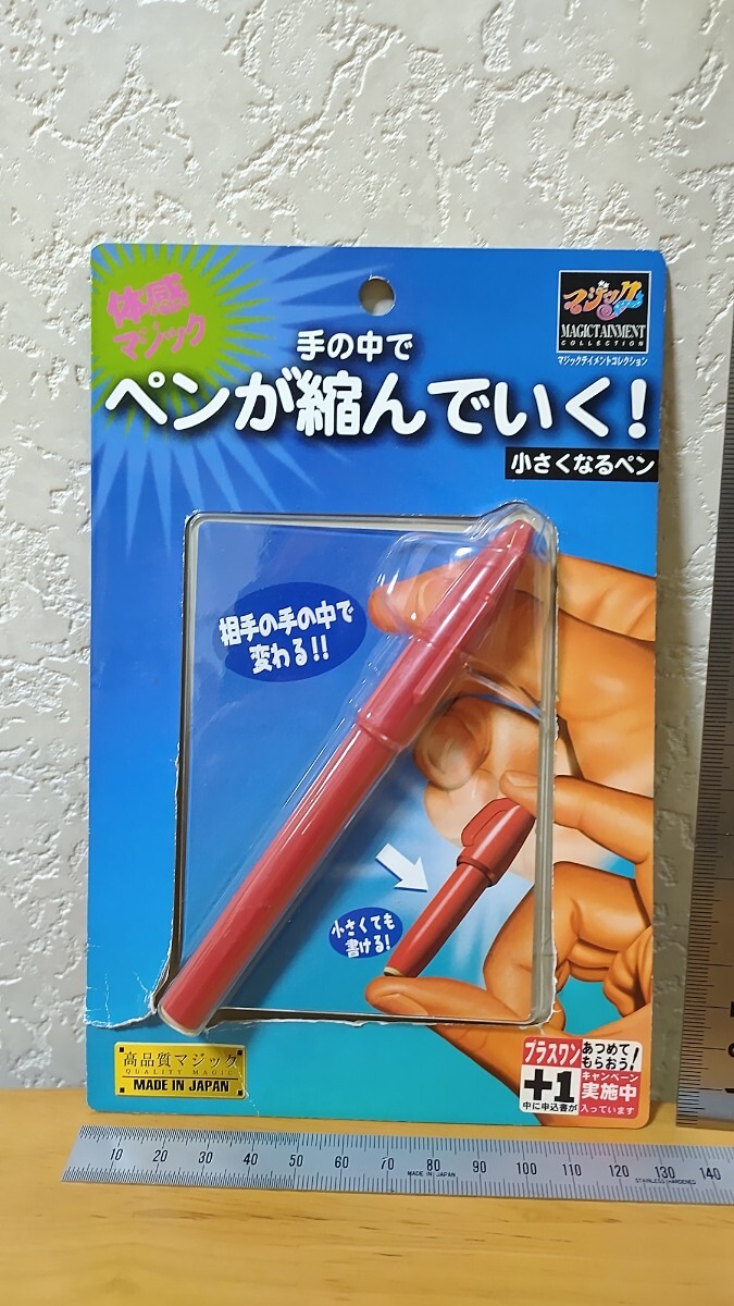 左手の手のひらにハンカチを掛けられ、(自分も仕事で普段使っている同じ形の)赤いペンをハンカチ越しに右手で持ち、左手の手のひらに当てます。マジシャンの指示で右手で押すとズブズブとペンが小さくなるのが体感出来ます。ハンカチを取ると小さくてカワイイペンがあります。