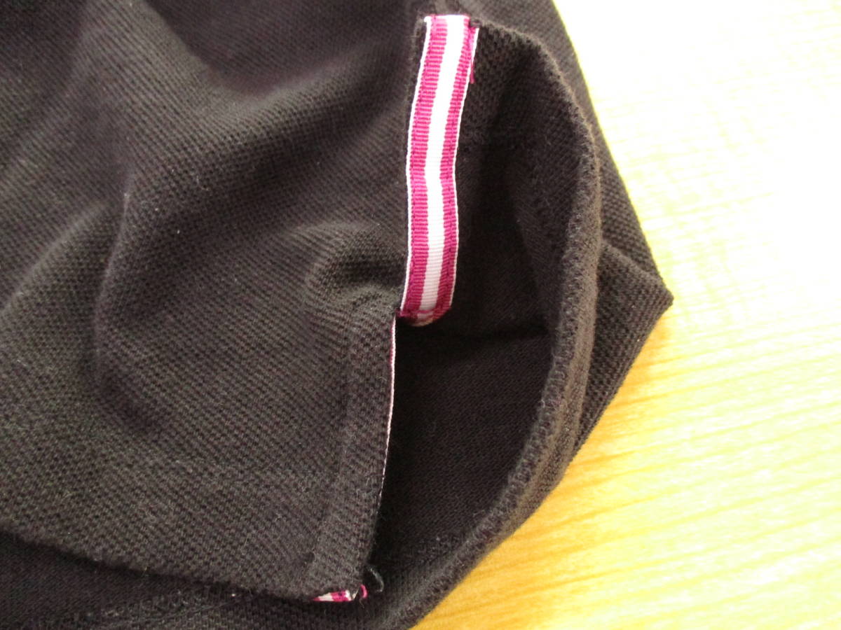 ・襟周り裏、ボタン裏、スリット裏にピンク×白ラインの