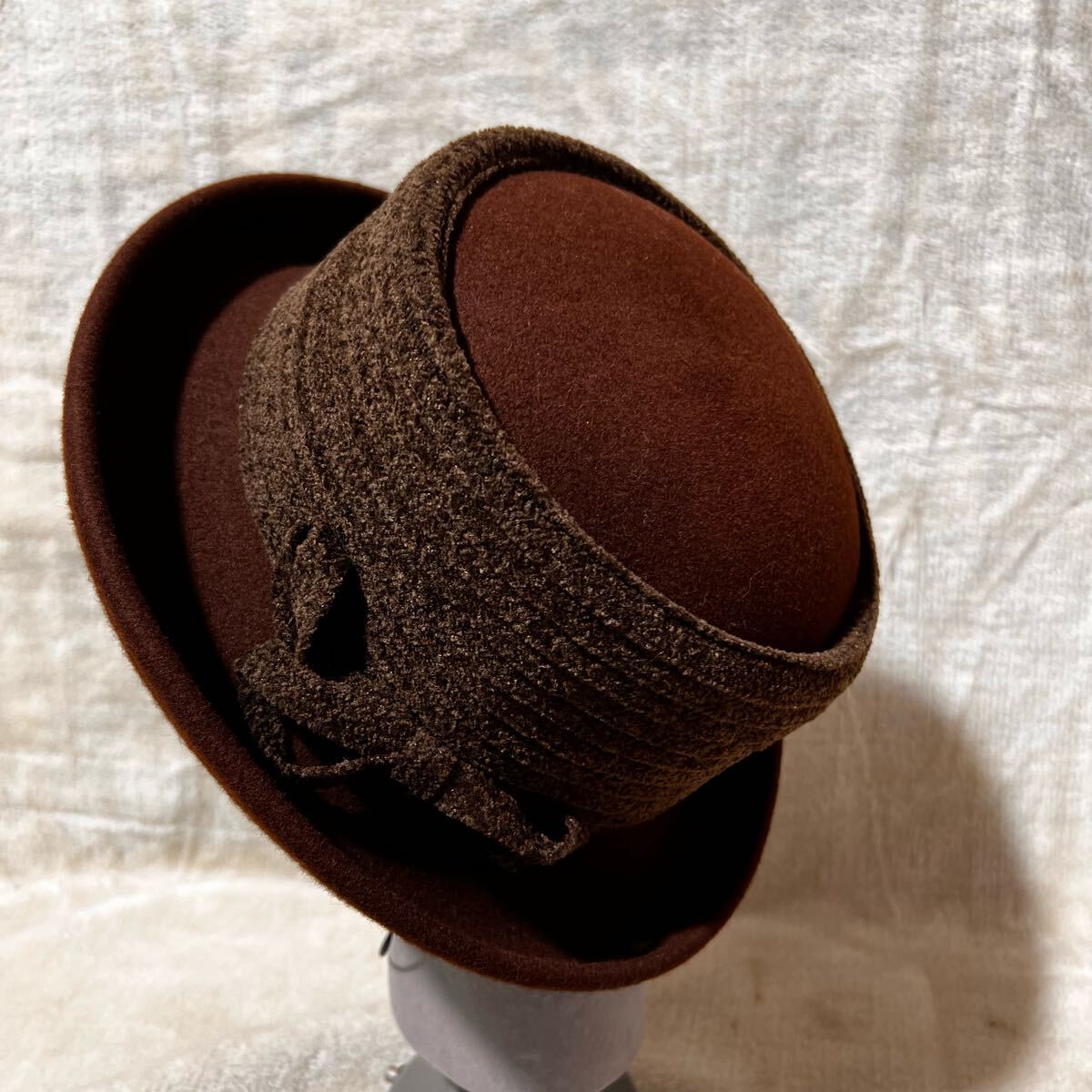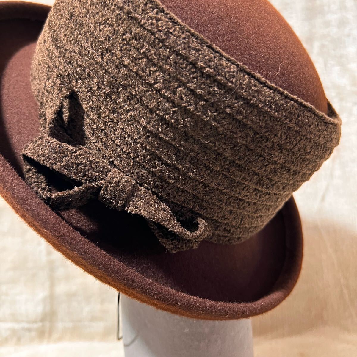 クラウン部分には起毛感のある横巻き装飾とリボン付き