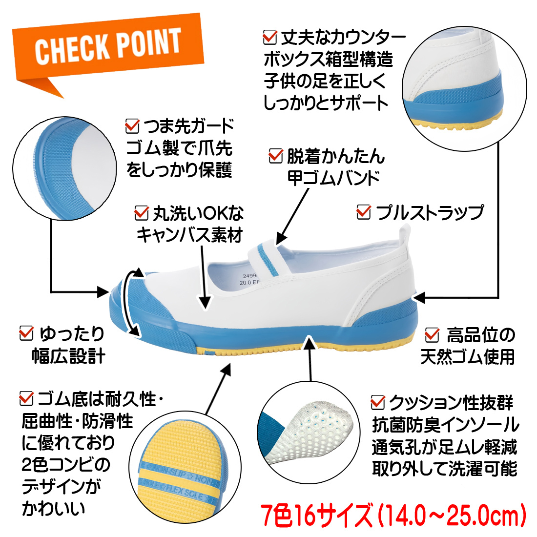 7色のカラーバリエーション、14.0cm~25.0cmと豊富なサイズをご用意しました。デザイン性と機能性に優れて、子供に喜ばれる一足です。
