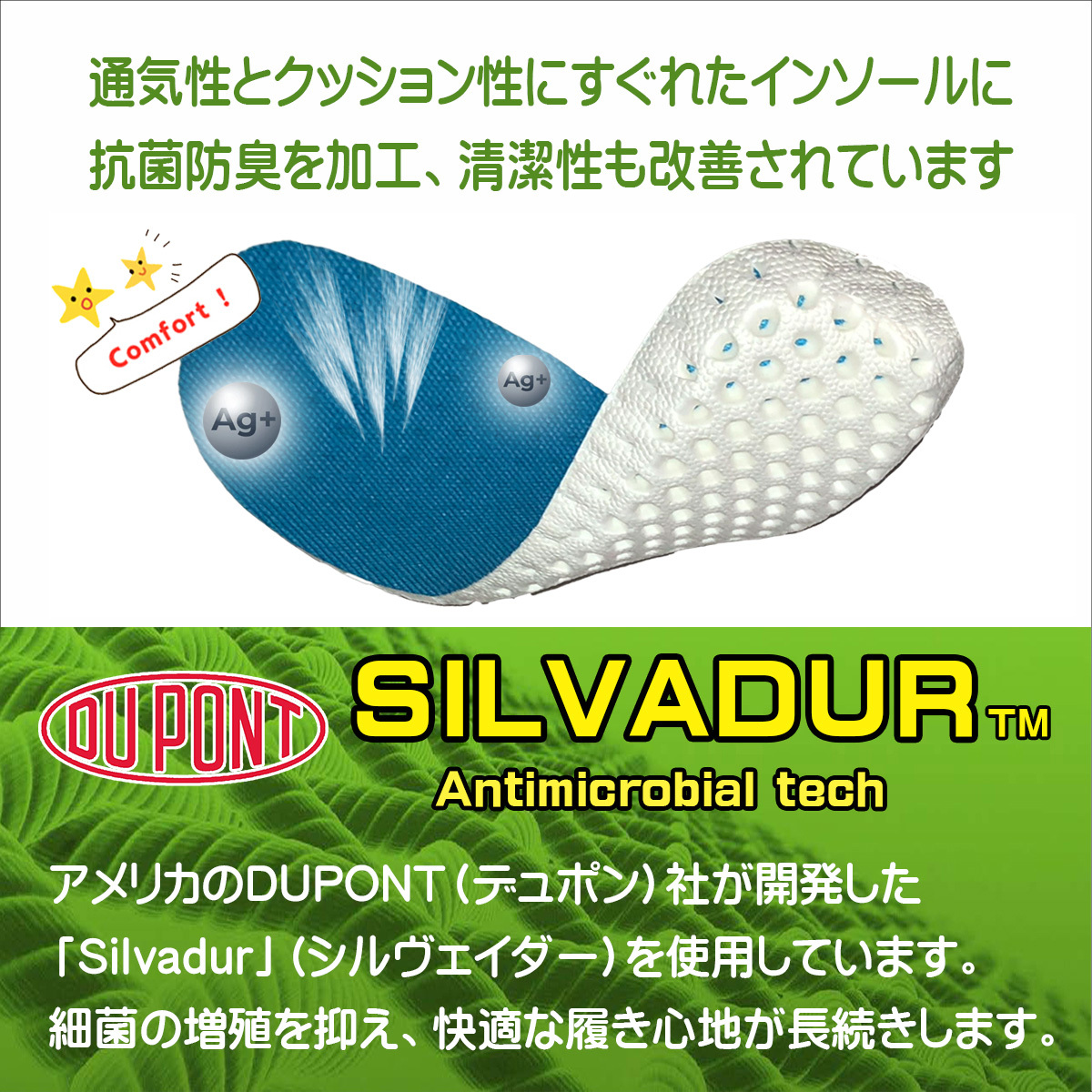 カップインソールには通気孔の加工をしており、クッション性が良く足裏の通気性抜群。アメリカデュポン社の薬剤を使用して抗菌防臭加工も施されており、取り外して丸洗いが出来るので、靴を清潔を保つことが出来ます。