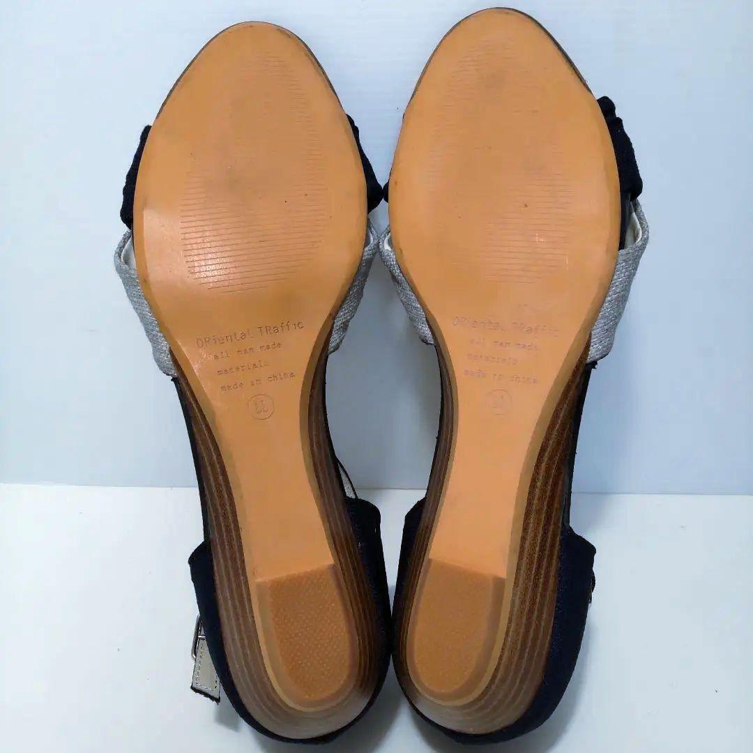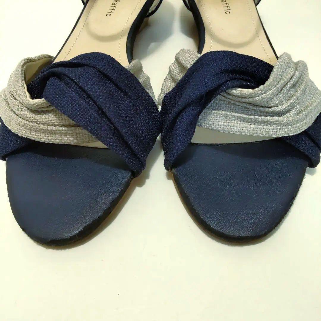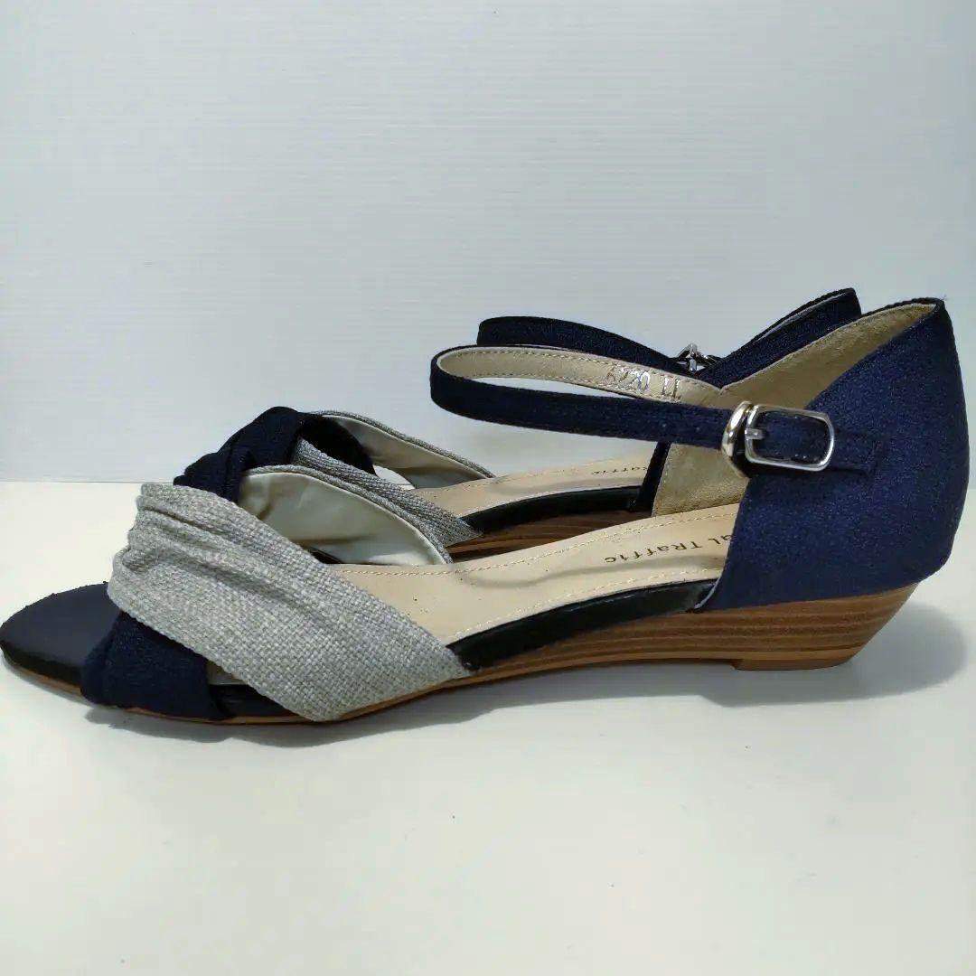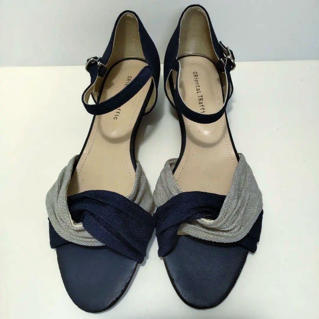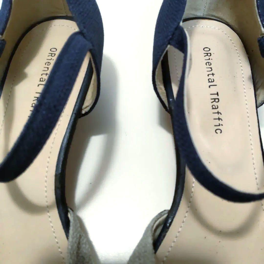 ORIENTAL TRAFFICのネイビーとグレーのクロスデザインサンダル、ウェッジソールで快適な履き心地。