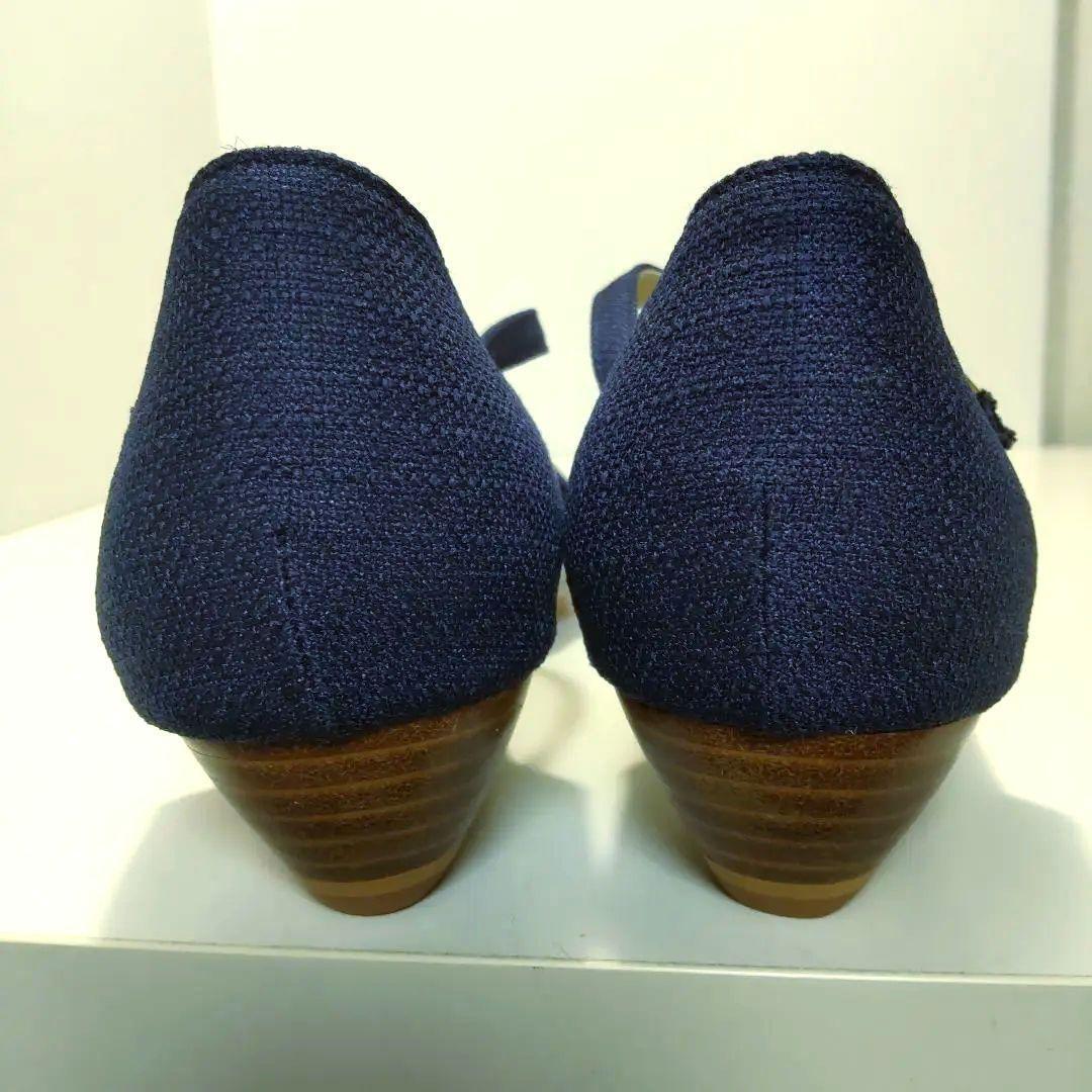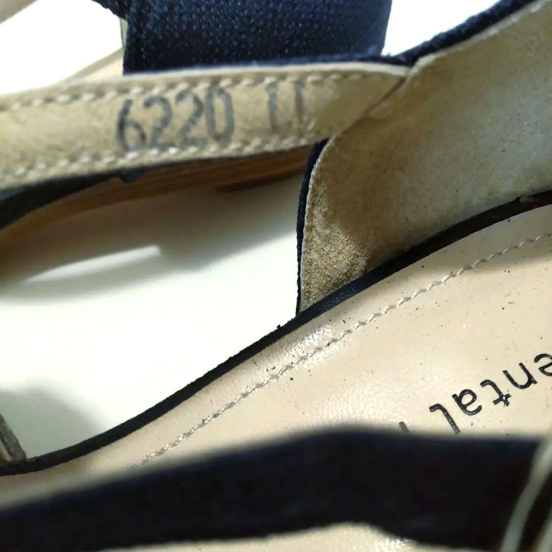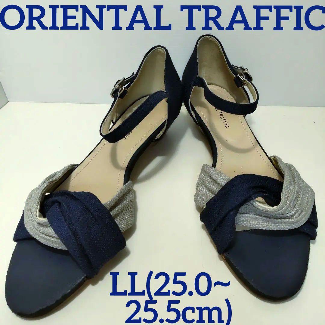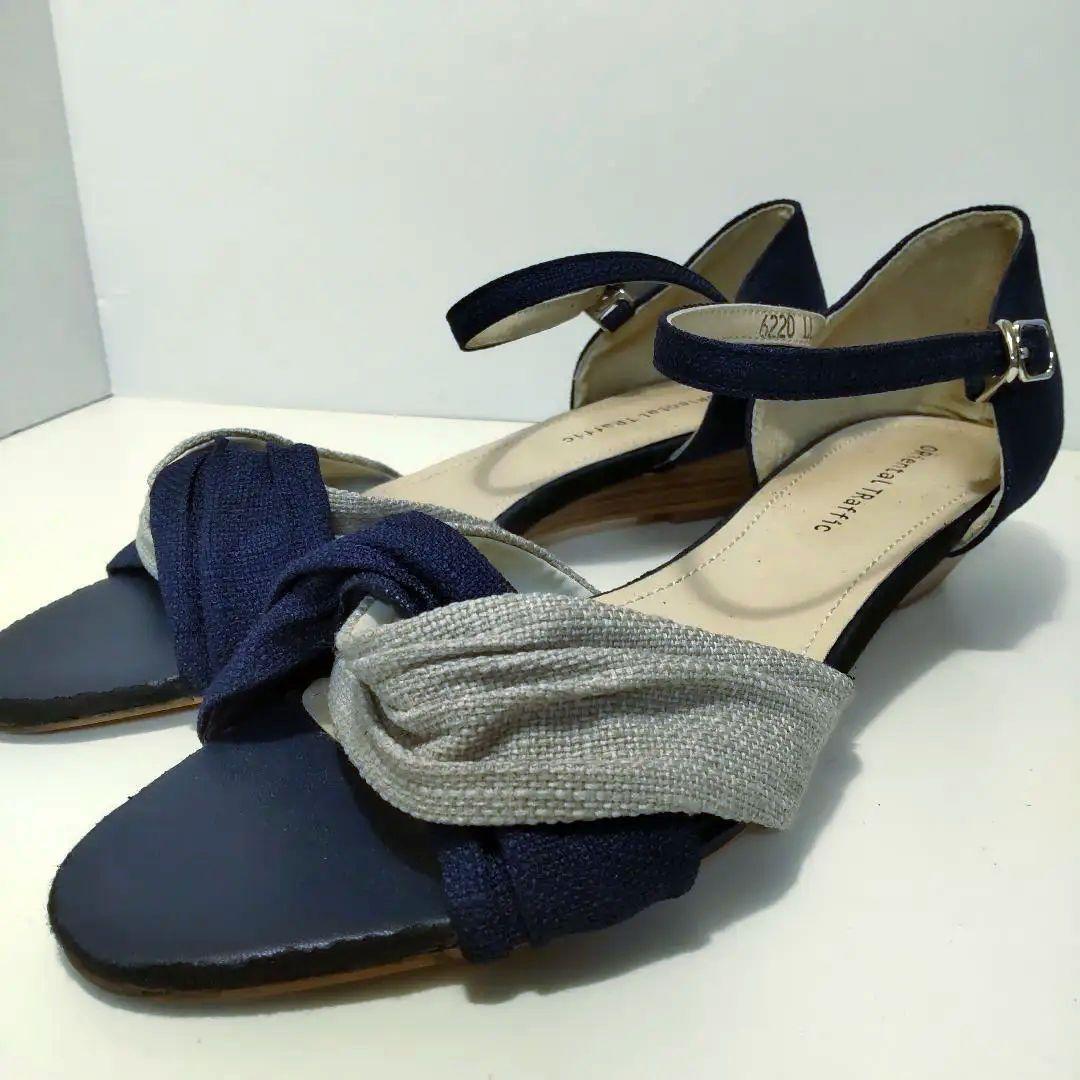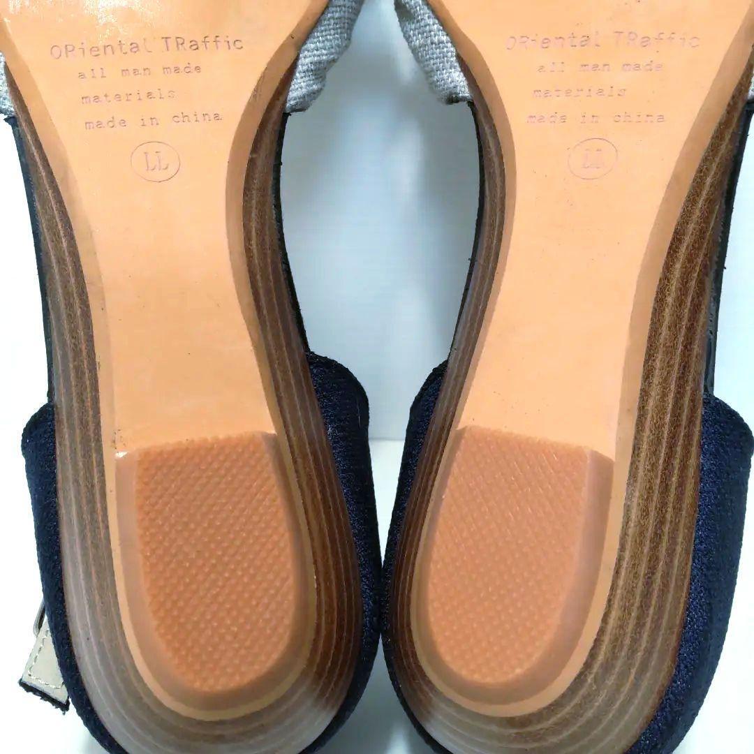 ORIENTAL TRAFFICのネイビーとグレーのクロスデザインサンダル、ウェッジソールで快適な履き心地。