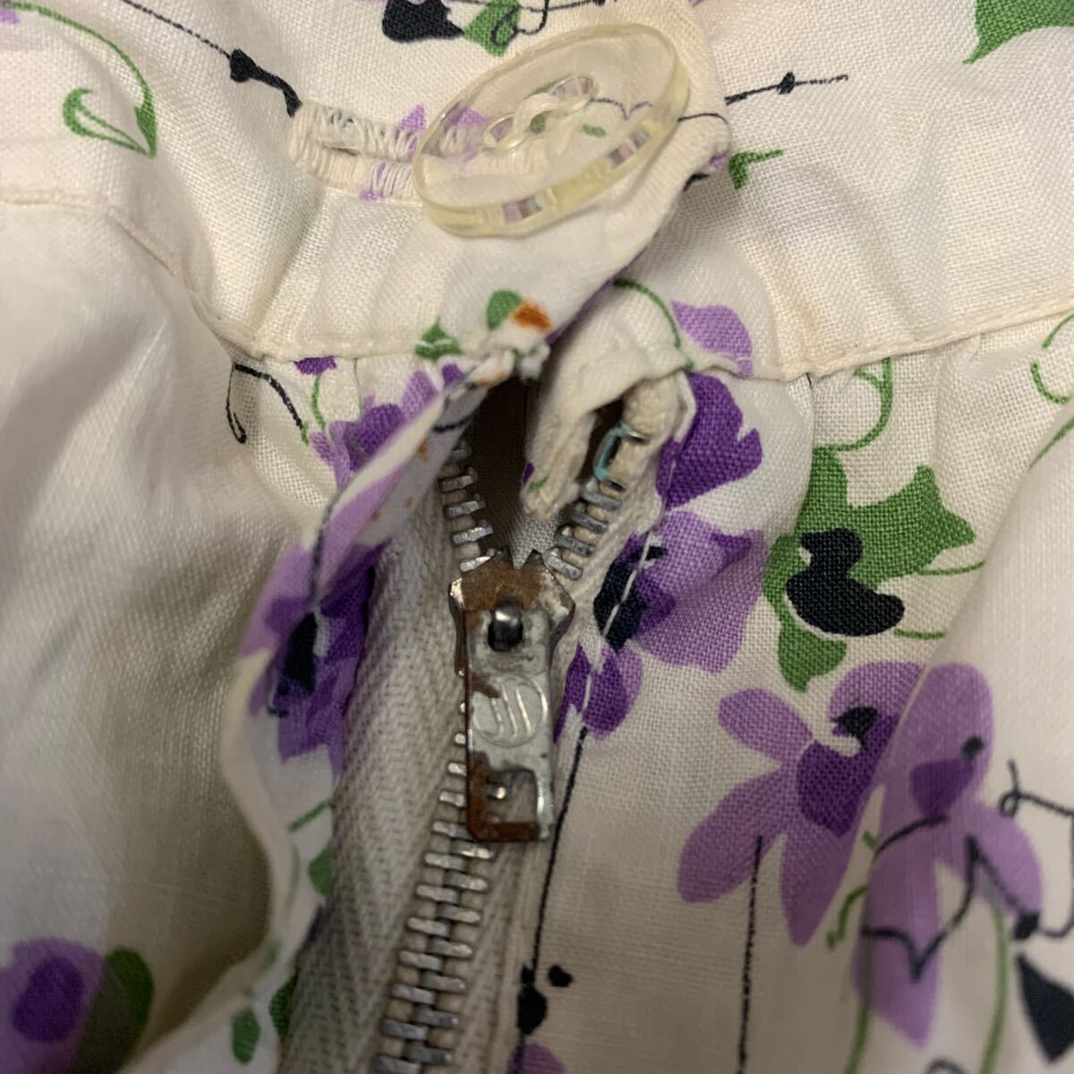 ブランドタグはついていません。ウエストは猫目ボタンとコの字のジッパーです(写真2)。ジッパーにサビがあります。動きは正常です。