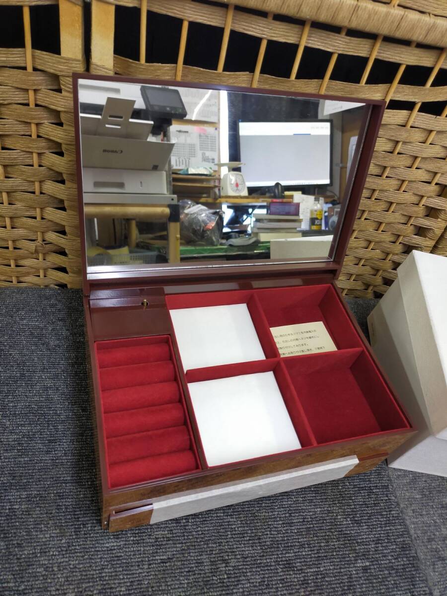 上部は開閉式でミラー付き、内部は赤いベルベット調の仕切りがあり、リングや小物を整理しやすい仕様です。