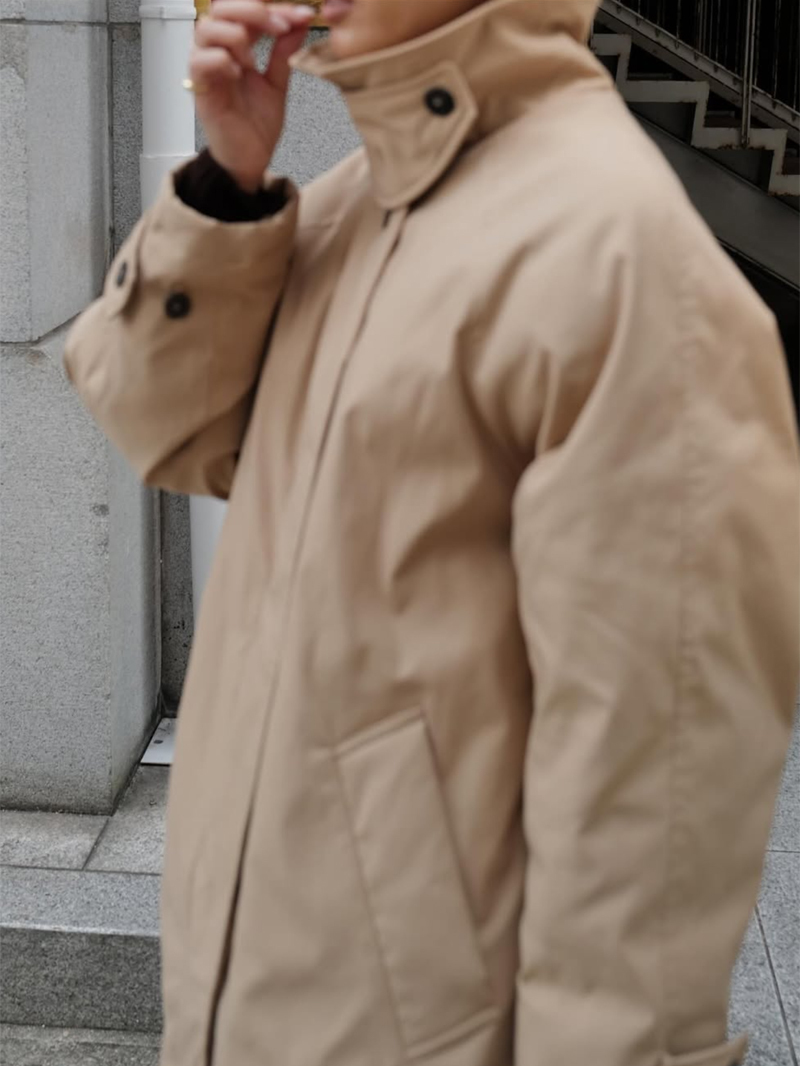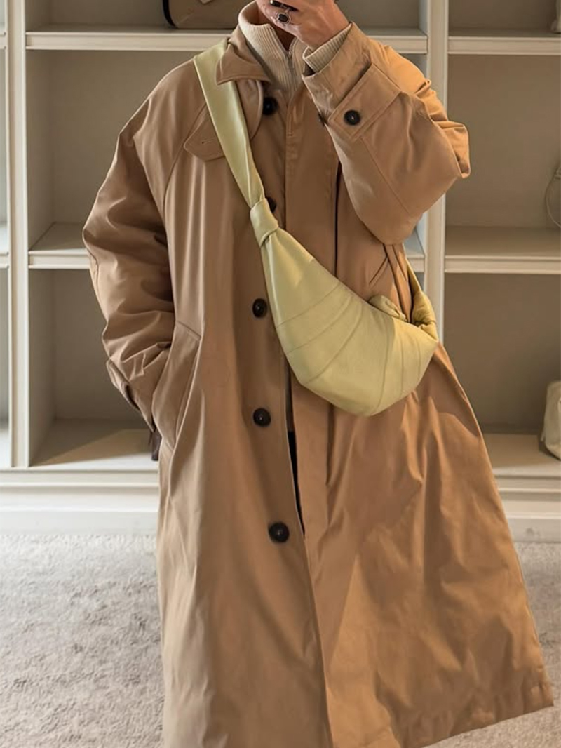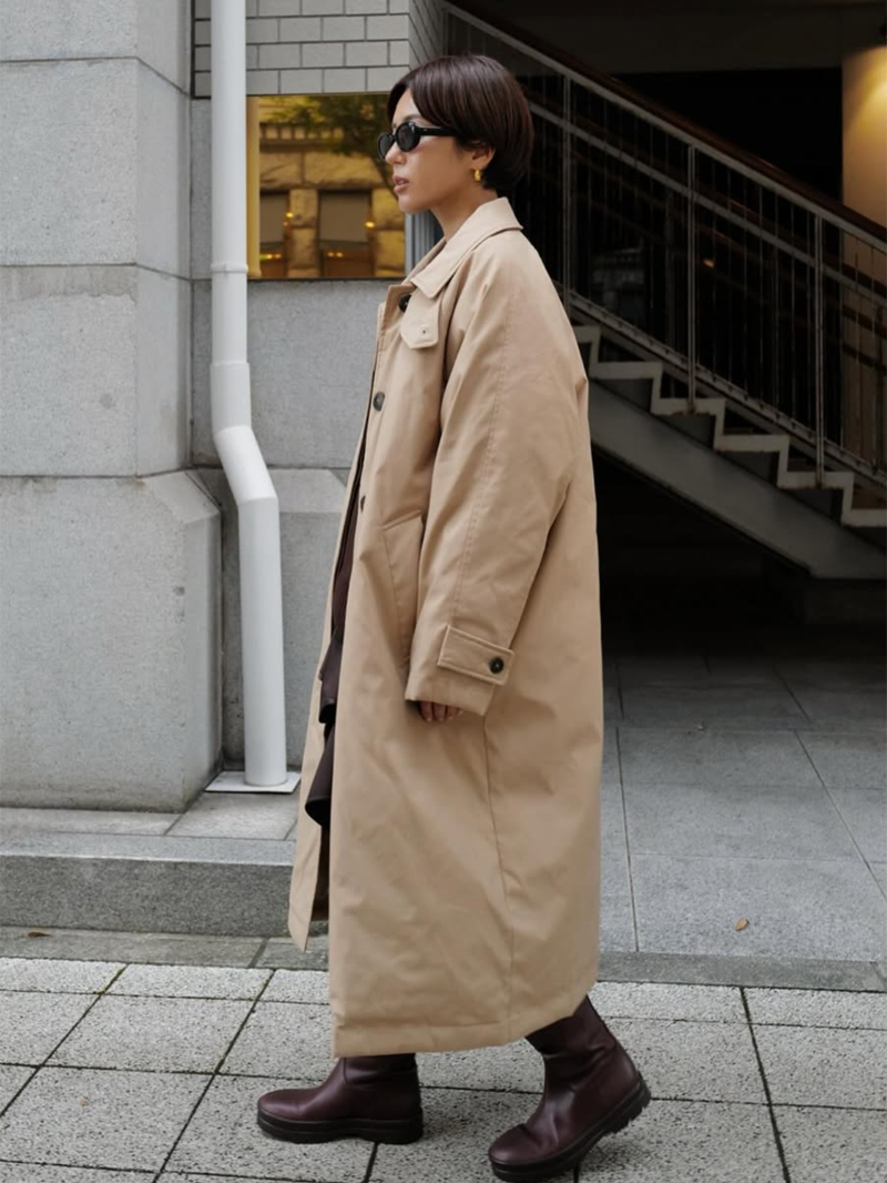 シンプルでスタリッシュなコクーンシルエットで仕立てた中綿トレンチロングコート。