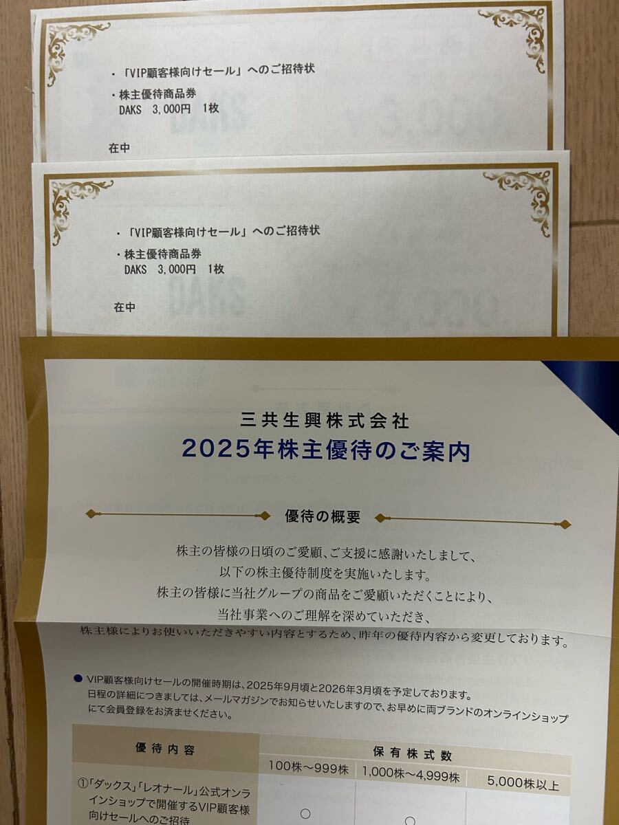 最新 三共生興株主優待 DAKS公式オンラインショップ 商品券3000円×2枚 ダックス 2026.6.30迄