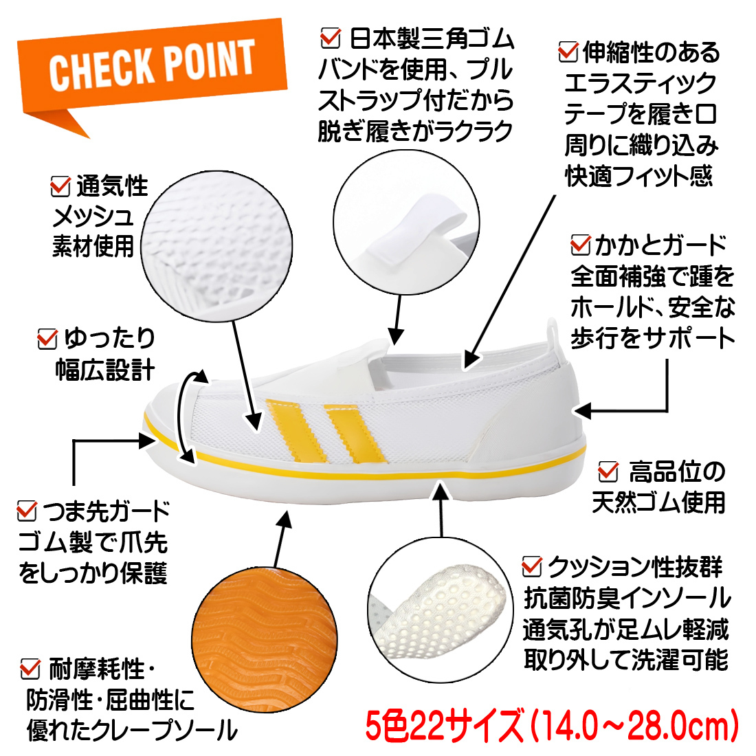 5色・22サイズのバリエーションを豊富に用意しており、子供から大人まで対応。通園・通学・通院・研修での使用はもちろん、リハビリ・介護など、幅広い場面で活躍する一足です。