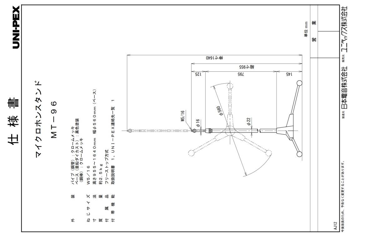■MICST-24 UNI-PEX ( ユニペックス ) / MT96 フリーストップ式 マイクスタンド  床上マイクスタンド 96~164cm 中古 使用少ない