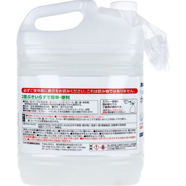 大容量つめかえ用 2度拭きいらずで簡単便利 床/壁/テーブル/家具/照明器具etc・・・ ほのかな緑茶の香り 泡タイプスプレー容器に詰め替えてのご使用が便利です 廃棄しやすいボトルです押しつぶすことによって容器が小さくなります 【商品詳細】 個装サイズ:207mmX296mmX126mm 個装重量:約4700g 内容量:4.5kg 用途:机・テーブル(化粧板)、床(フローリング、ビニール、畳)、壁、家具類、電気製品の洗浄。(対象物の取扱説明書を読んでから使用する。) 液性:弱アルカリ性 成分:界面活性剤(0.2%、ポリオキシエチレンアルキルエーテル)、溶剤 製造国:日本 発売元:カネヨ石鹸株式会社 JANコード:4901329220857 |