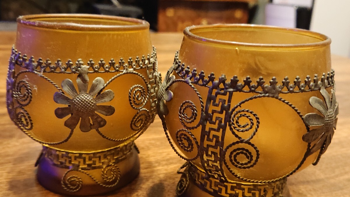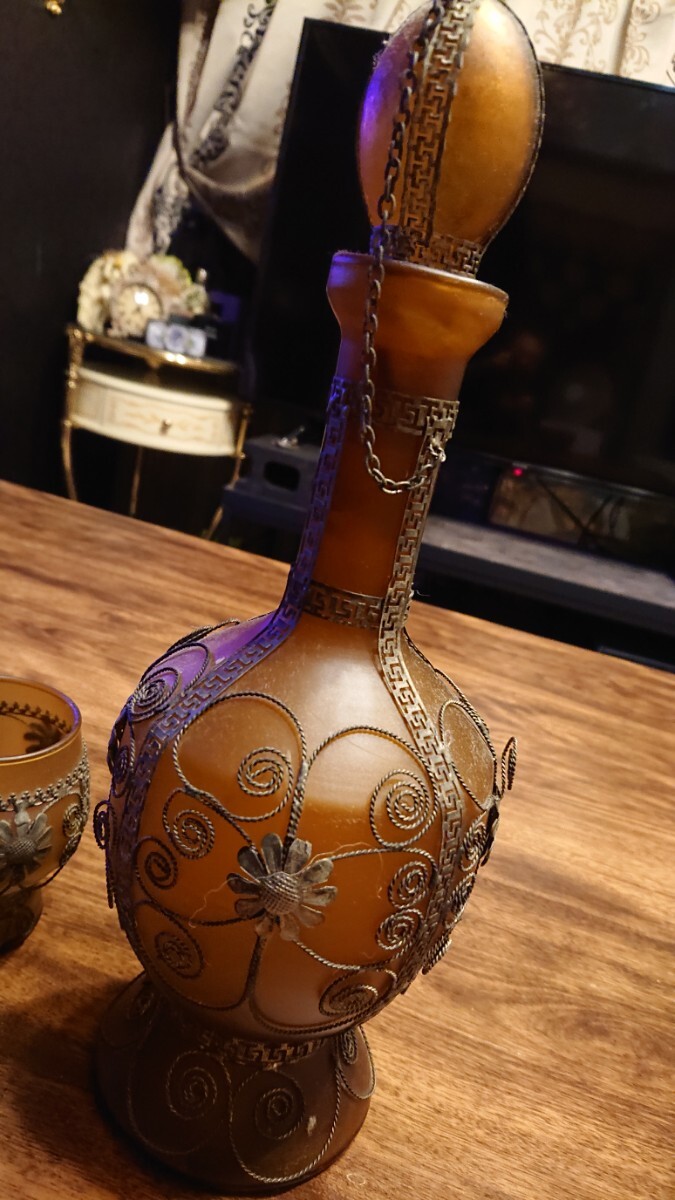 オールドガラス 酒牌セットです年代はわかりませんが年代物の細工がしっかりしたオブジェです コレクションにいかがですか 目立ったひびや割れはありません 神経質な方は古いものなのでご遠慮ください ボトルサイズへ7合サイズ 酒呑みは湯飲みサイズです 宜しくお願いいたします