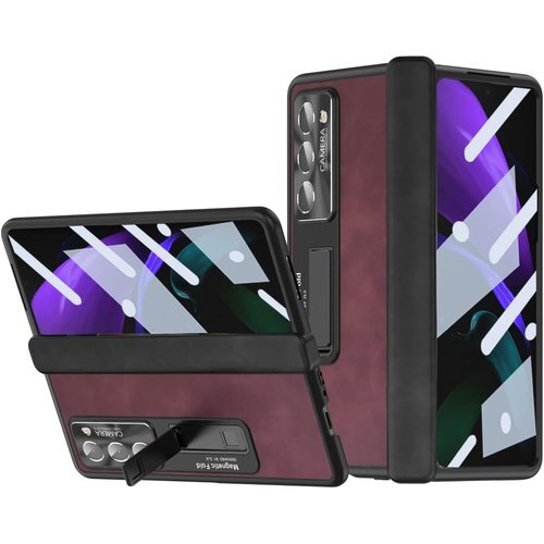 Galaxy Z Fold2 / W21携帯全面保護ケース 手帳型 ナッパレザー 強化ガラスフィルム 金属レンズ保護カバー+ライチ 磁気吸着 ブラケット機能 QI充電サポート折り畳み おしゃれ 、人気 かわいい フリップ 衝撃吸収 キラキラ QI充電 ワイヤレス 財布型カバー、面白い 二層構造 スタンド フリップ 取り外し - 赤 1739